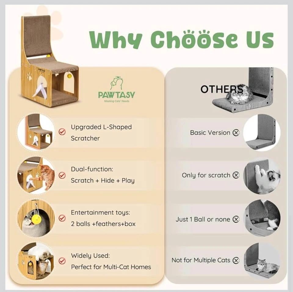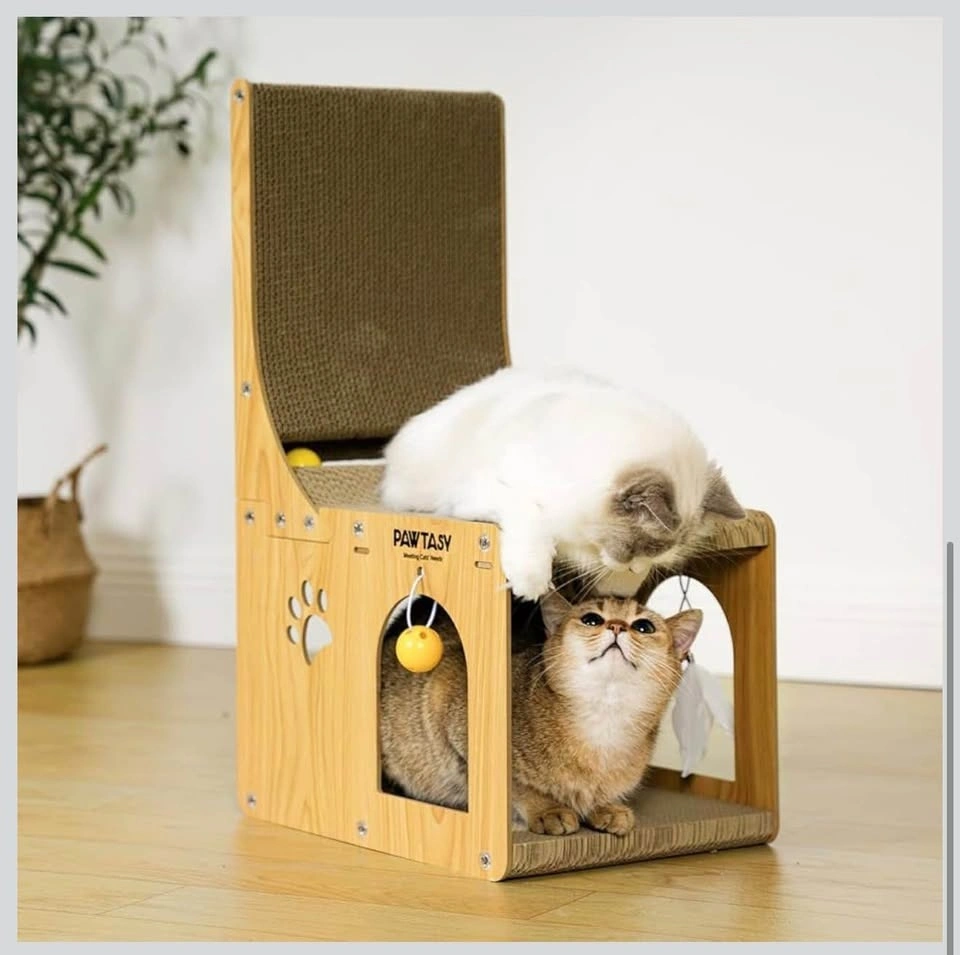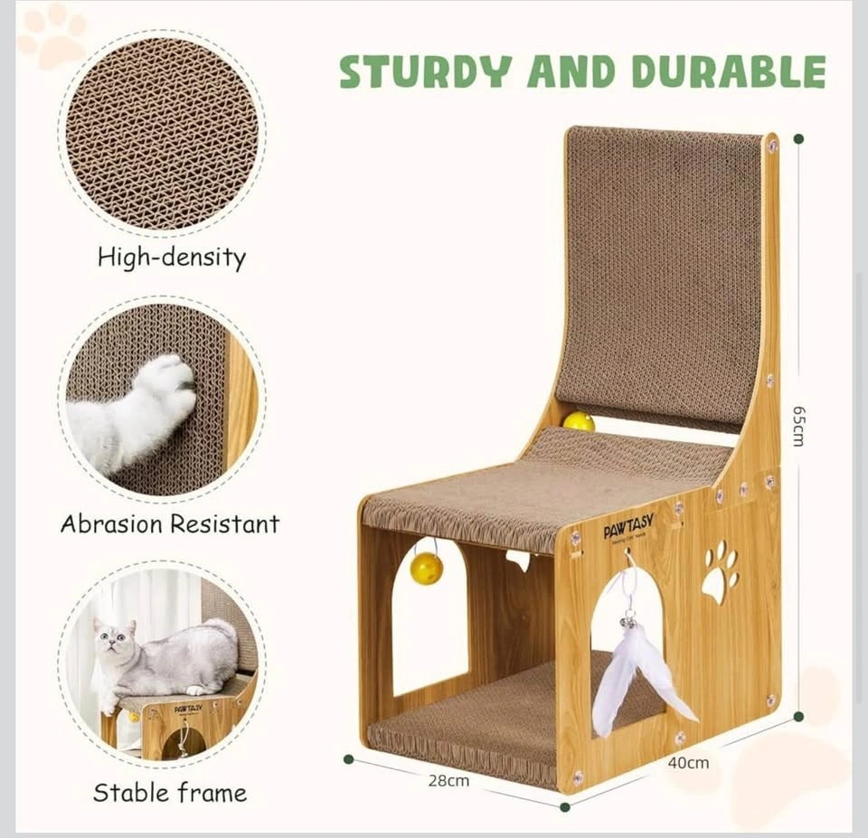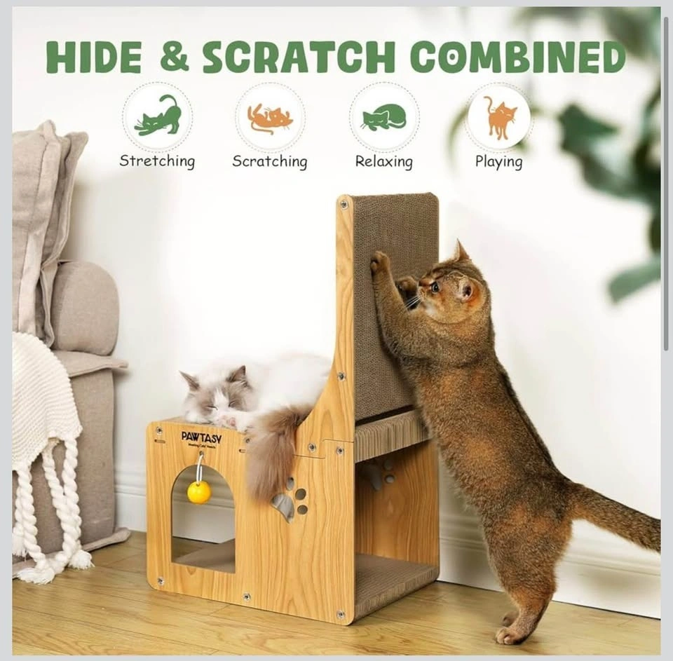 Brand new 2-in-1 cat scratcher and hideaway. Cats can scratch vertically and horizontally, and hide inside. Includes trackball, feather toys, and jingle bells for extra fun. Eco-friendly, non-toxic cardboard with easy tool-free setup. Dimensions: 27.9L × 38.1W × 63.5H cm.