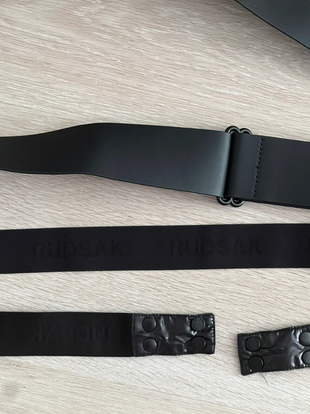 This is a black belt from Rudsak. It has an elasticated band with "RUDSAK" embossed on it. The belt also includes a snap closure. ** came with my jacket, took off right away and haven’t used it **