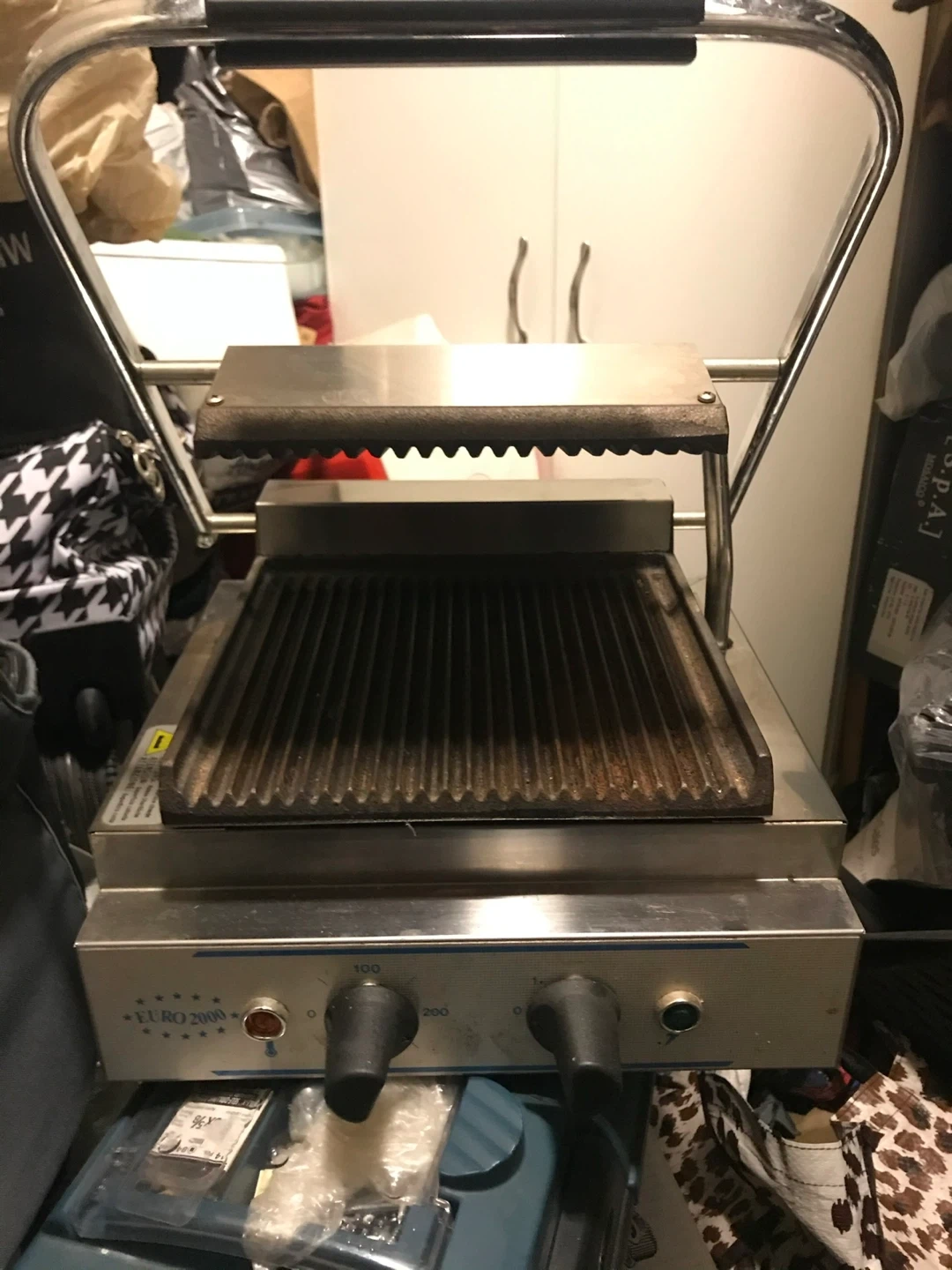 This is a EURO 2000 panini press grill. It features a stainless steel body and adjustable temperature controls. The ribbed grill plates are great for making sandwiches and other grilled items.