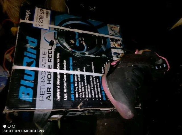 Keep your workspace tidy with this BluBird Retractable Air Hose Reel. It features a heavy-duty steel construction, a fully retractable hose, and a ratcheting mechanism with an adjustable hose stopper. Ready to make managing air hoses a breeze! Cash accepted.