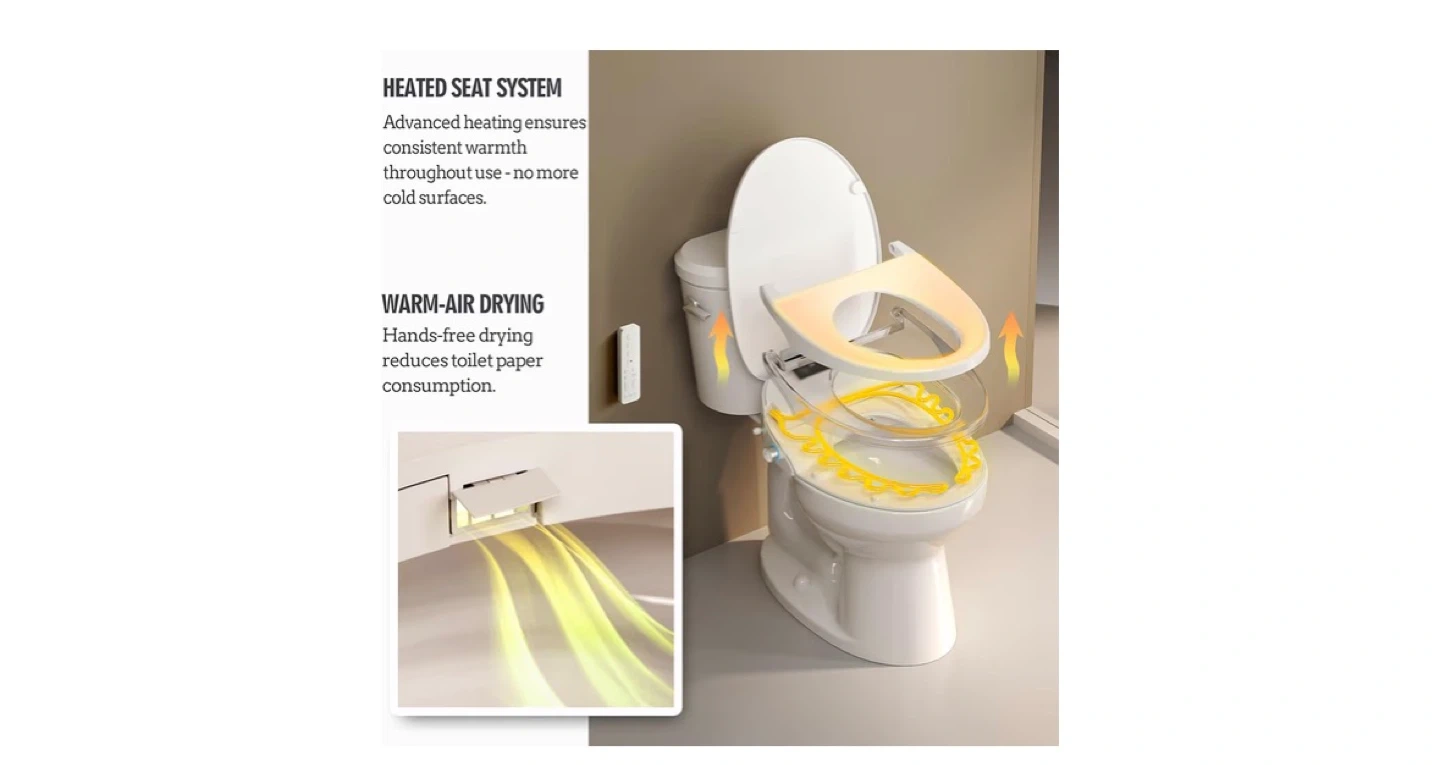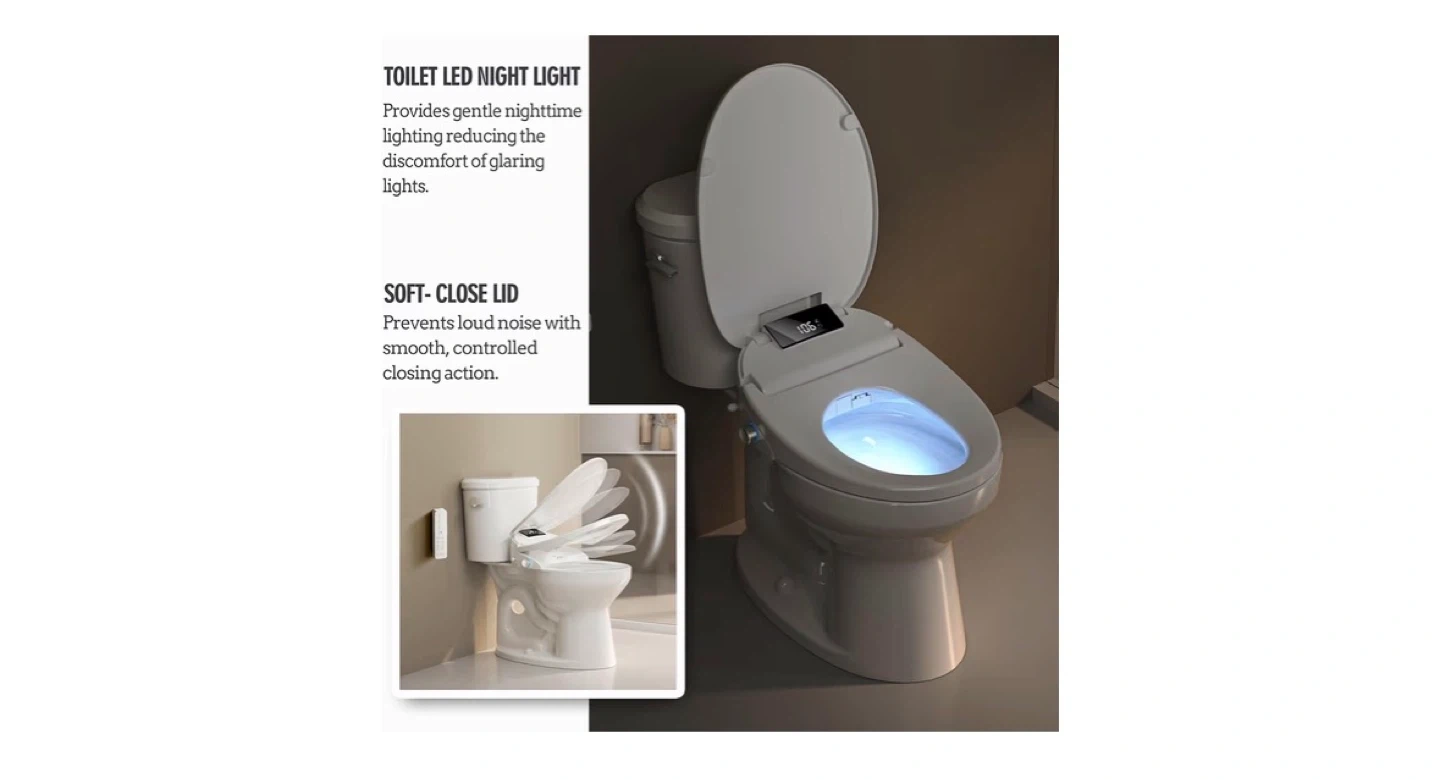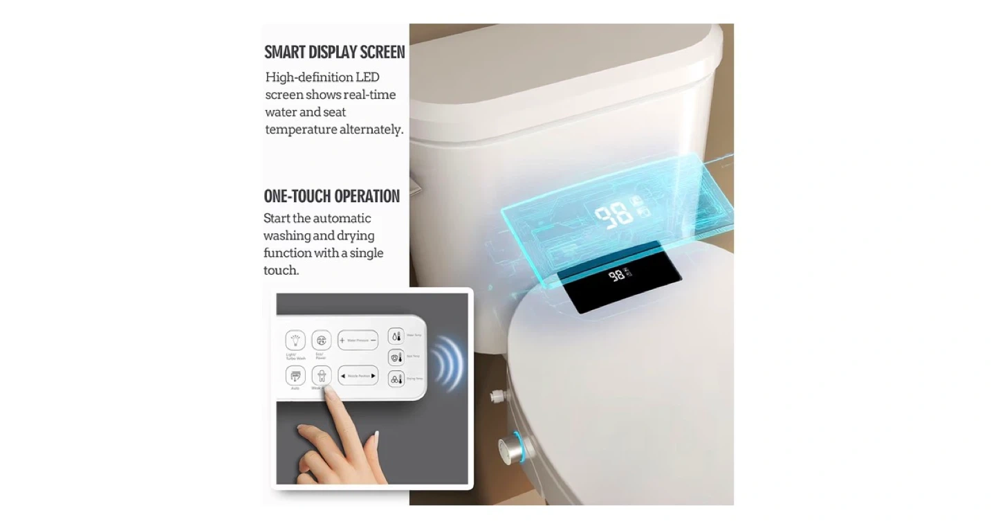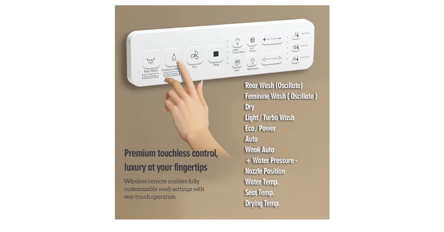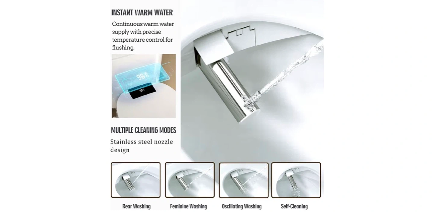 This WLIBIDET smart toilet seat offers instant warm water with precise temperature control. It has multiple cleaning modes including rear washing, feminine washing, oscillating washing, and self-cleaning functions. The smart display screen shows real-time water and seat temperature, and operation is via a one-touch remote. Stainless steel nozzle design for durability.