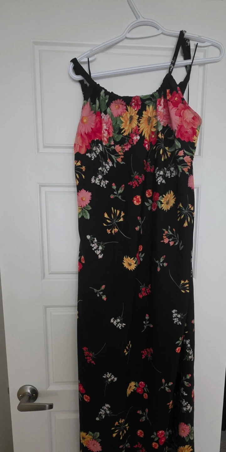 A black maxi dress with a colourful floral print. It features adjustable spaghetti straps and a gathered bust. This dress is lovely for summer occasions!