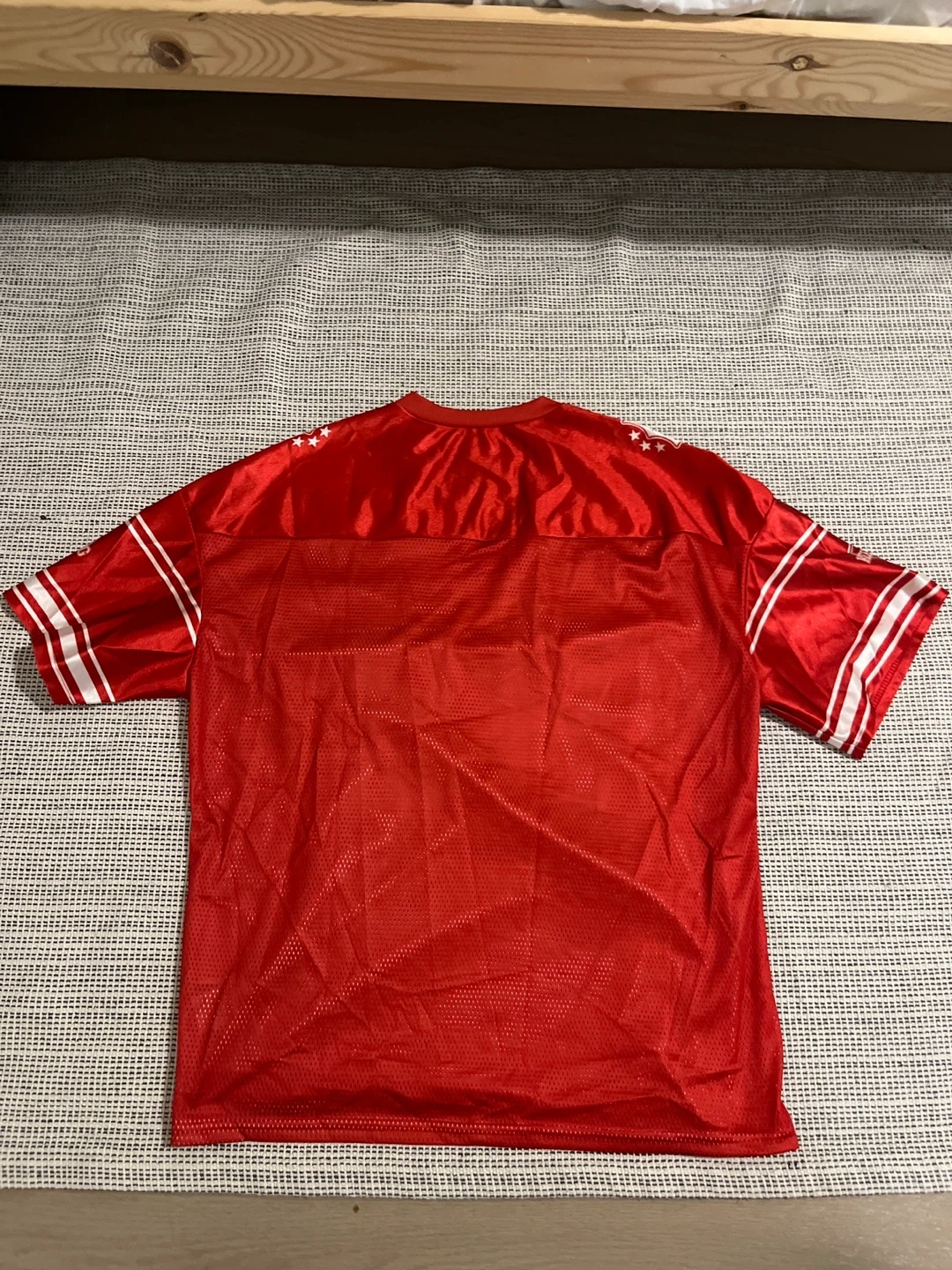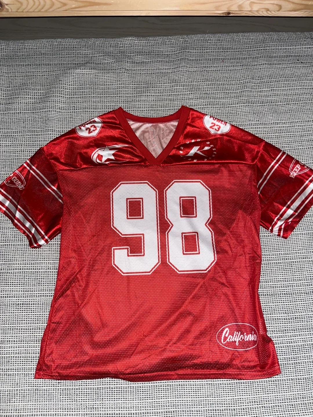 This is a bright red football jersey with the number 98 prominently displayed. It features "California" printed on the front hem and has white stripes on the sleeves. A great piece for any football fan!