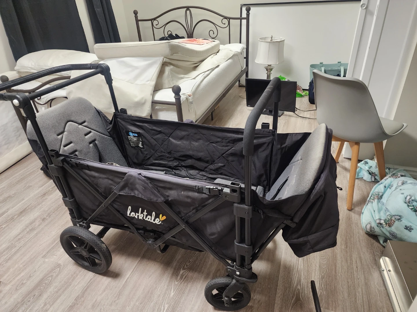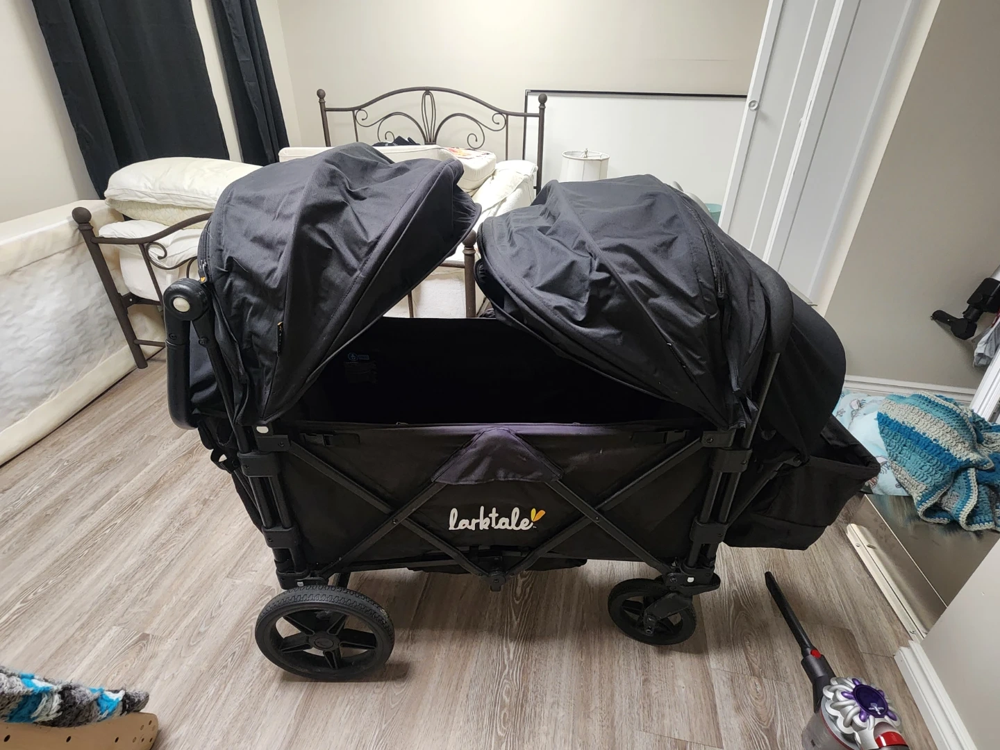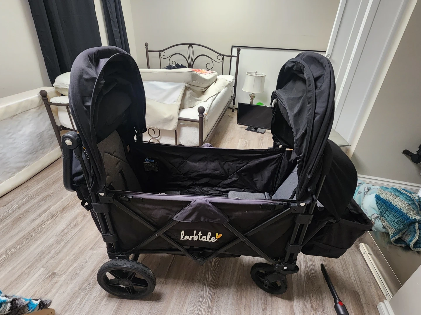 Selling a Larktale Caravan stroller wagon in black. It's in great condition and ready for new adventures! Perfect for families on the go, this wagon is super versatile and easy to use. It has lots of space for kids and gear.