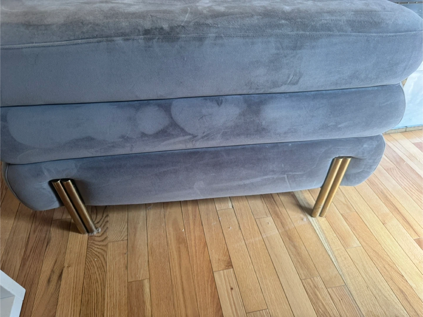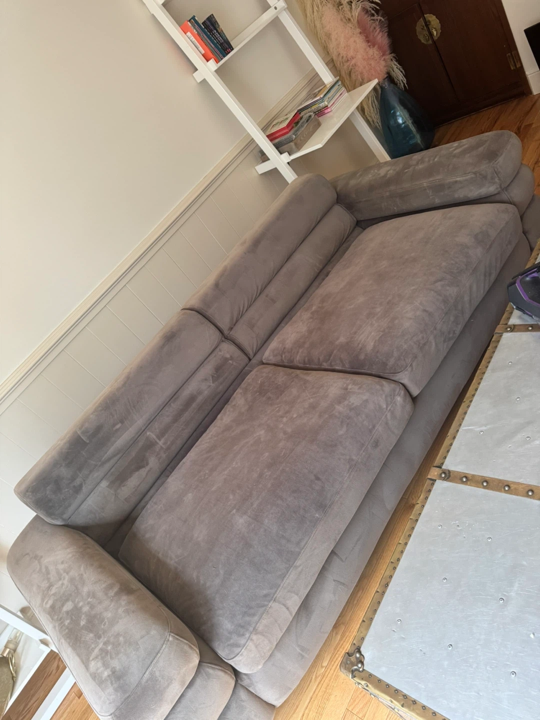 Grey sofa. deep seating. recently just got it clean and scotch guarded unfortunately it made the seating and arm area a bit stiff (the material). but the company said it’ll soften up once people start to sit on it again. paid almost $1700. Asking $650