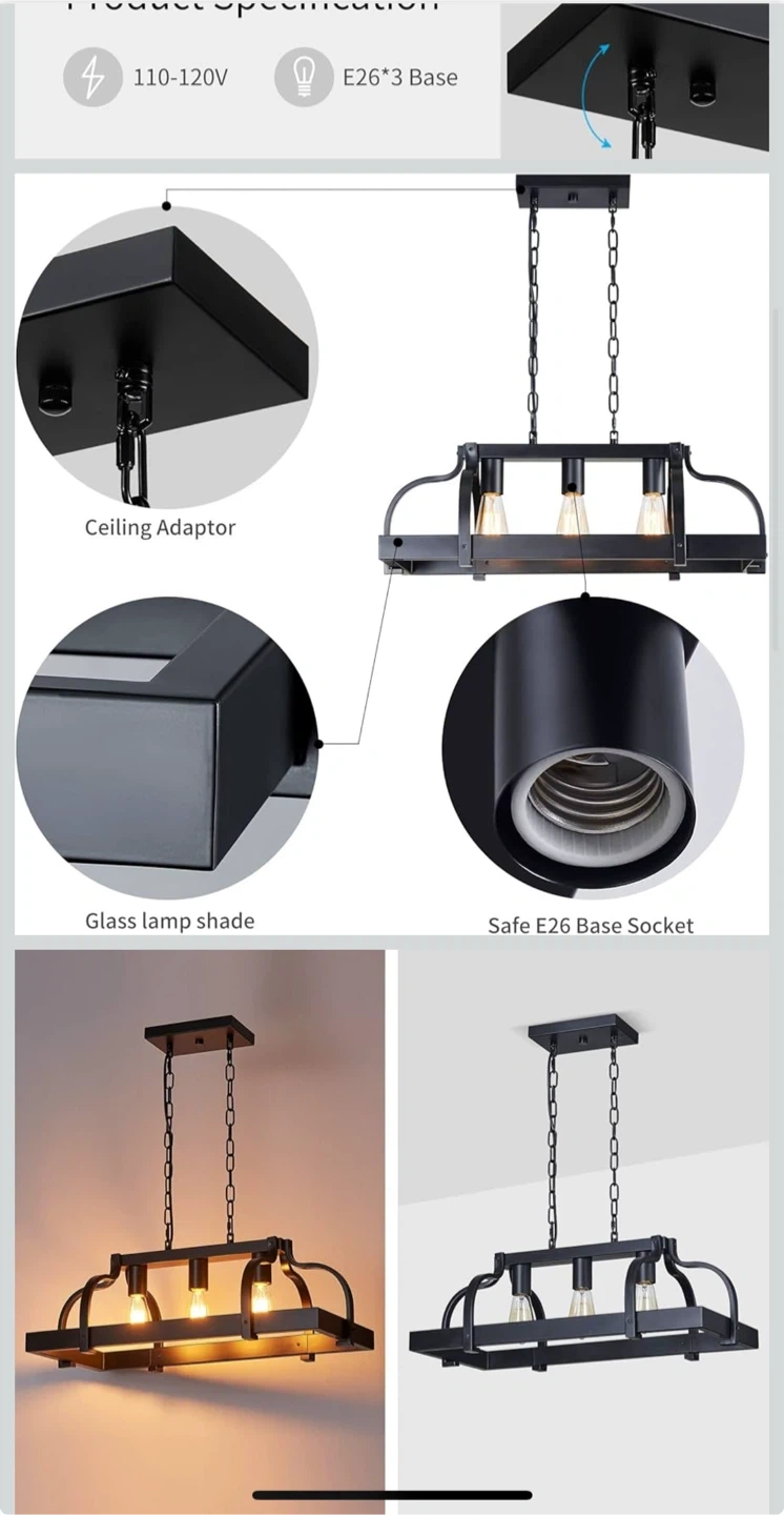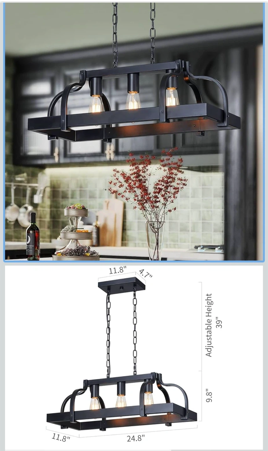 This black pendant light fixture features a rustic farmhouse design with three E26 base sockets. It's crafted from metal with a wood-look accent and offers adjustable height for easy installation. Perfect for your kitchen island or dining room!
