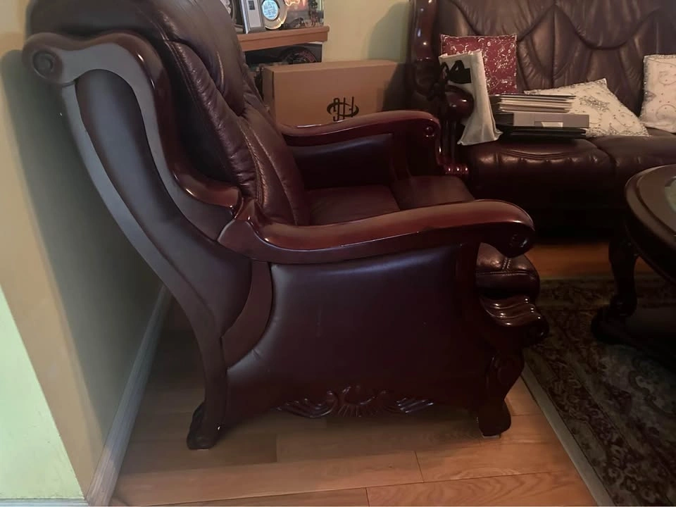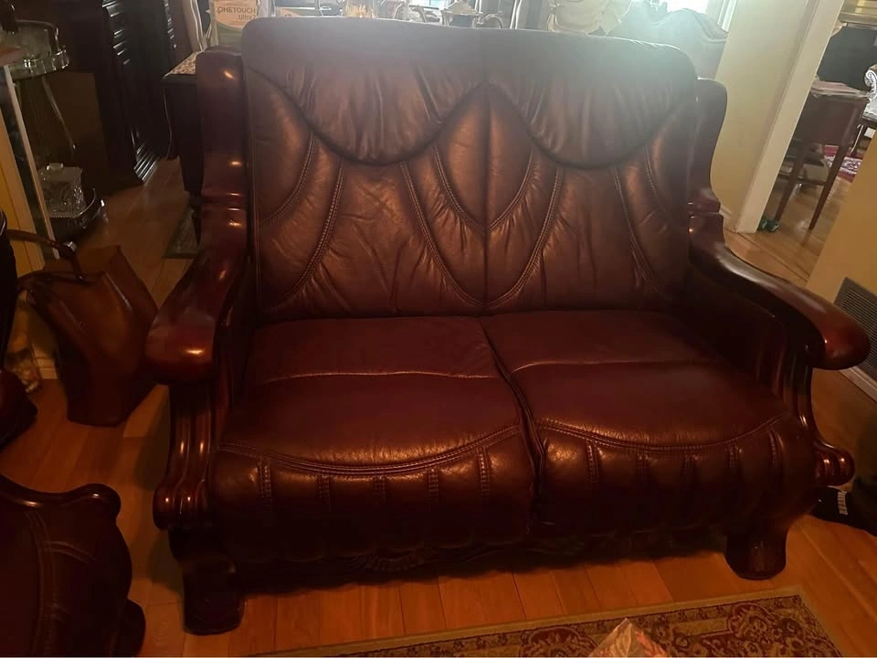 Classic leather sofa and armchair set. Both pieces have rich burgundy leather and ornate wooden frames. Sofa is a two-seater. Armchair has matching design. Good for living room or den. Selling single and 3 seat couch as well