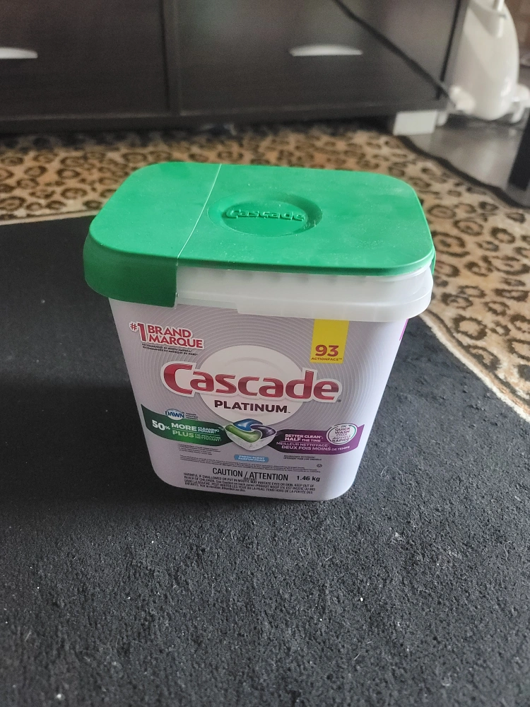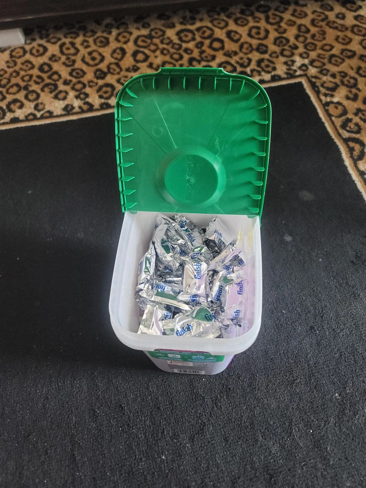 Selling a container of Finish dishwasher pods. we find the brick ones don't perform consistently in our dishwasher because our apartment building doesn't have good water softening. I put them into an old Cascade container for ease of transport. there are 76 left in the container.