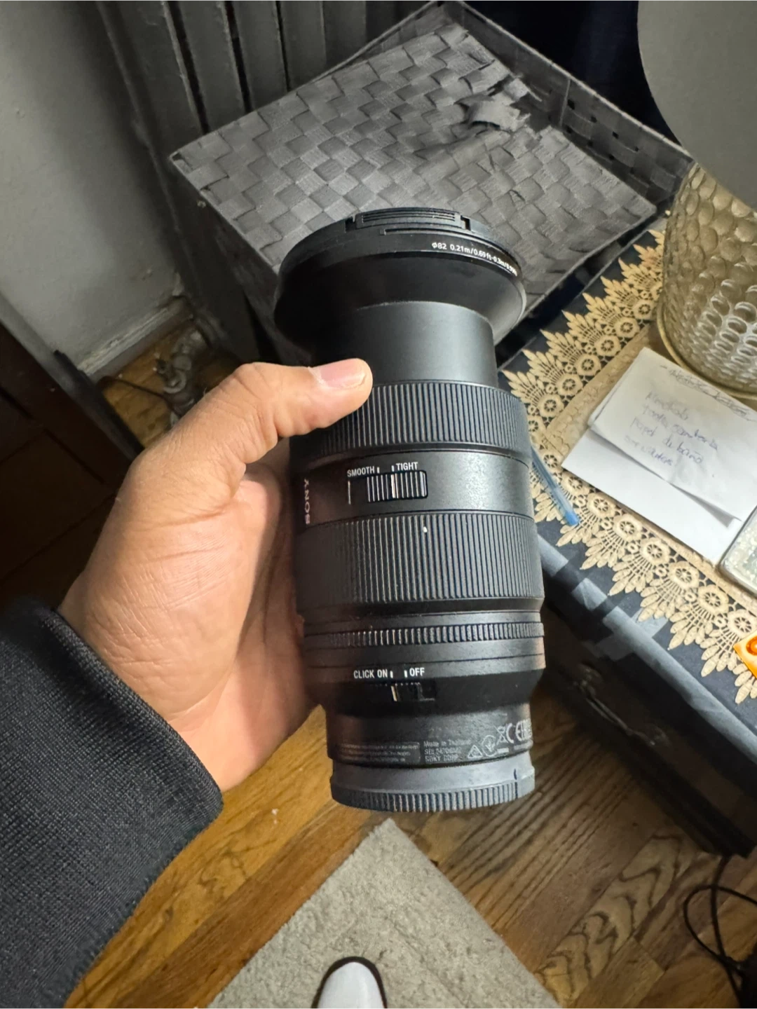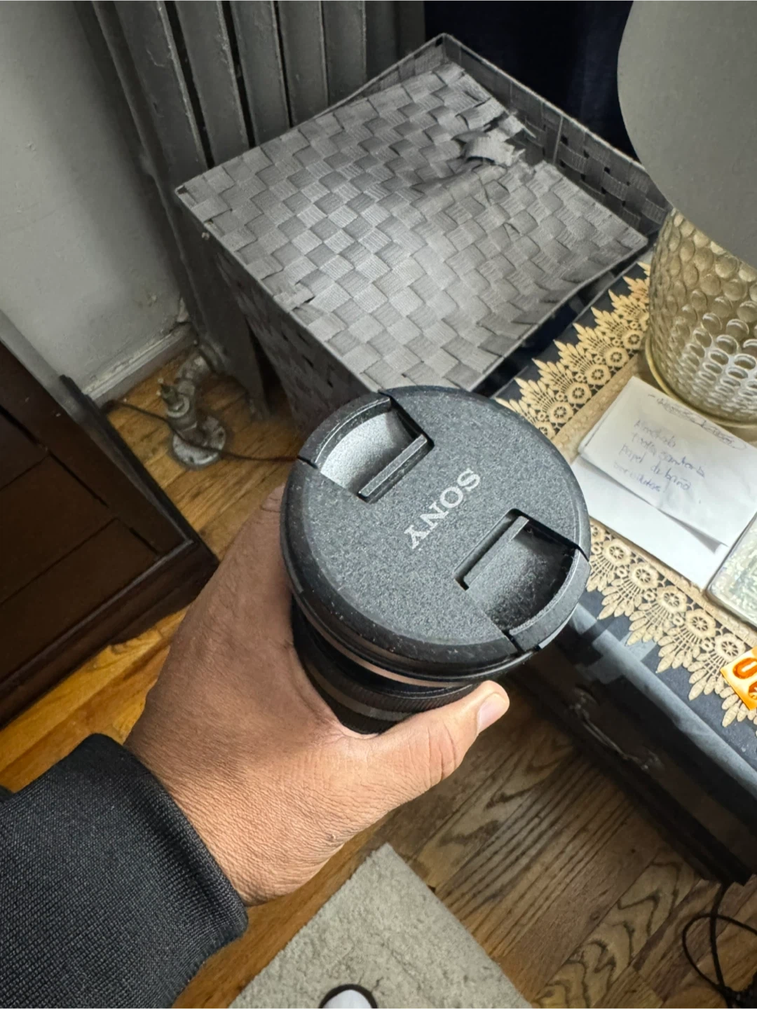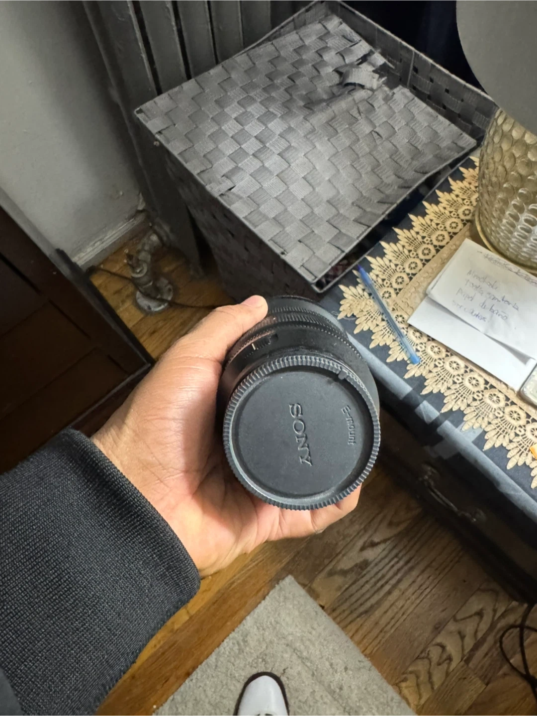 This is a Sony camera lens. It's black and has various controls for focus and aperture. Perfect for capturing high-quality photos and videos.
