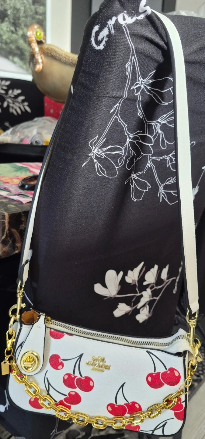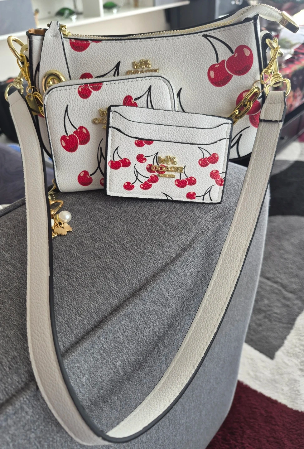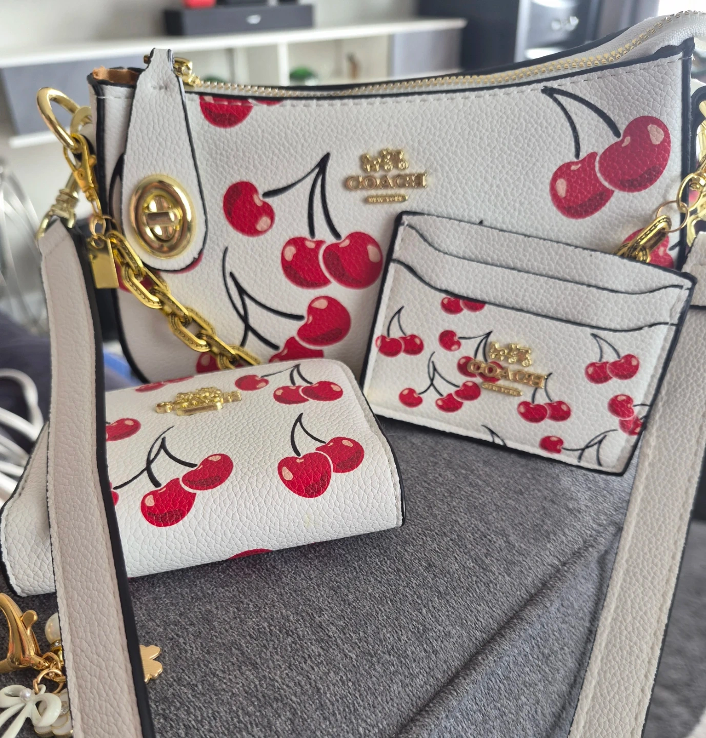 This is a Coach bag set featuring a playful cherry print on white leather. It includes a matching wallet and cardholder. The bag has a zip-top closure and a gold chain strap.
