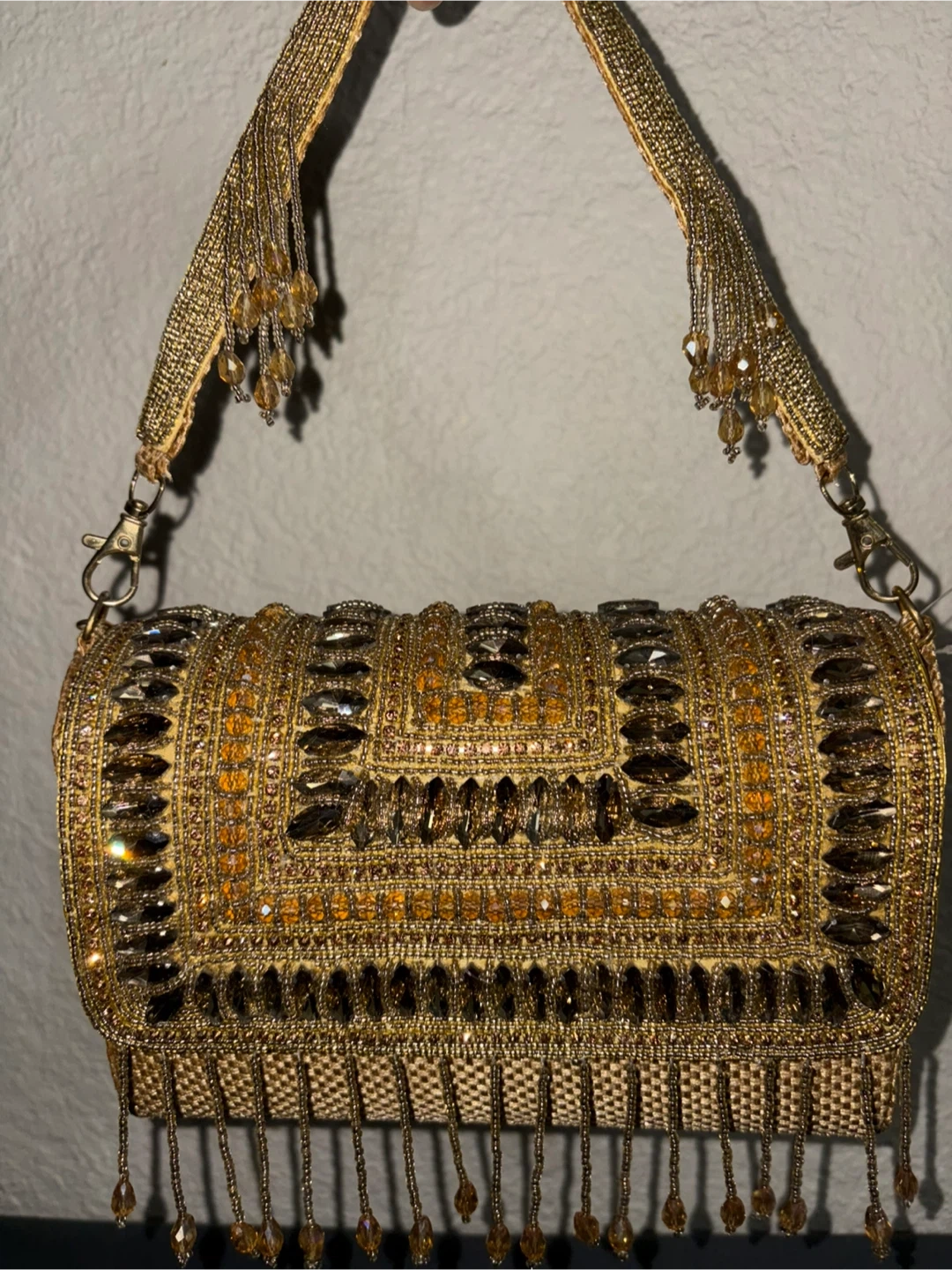 This evening clutch features intricate gold beading and sparkling embellishments. It's adorned with dangling bead tassels on the strap and bottom hem. A stunning accessory for special occasions!