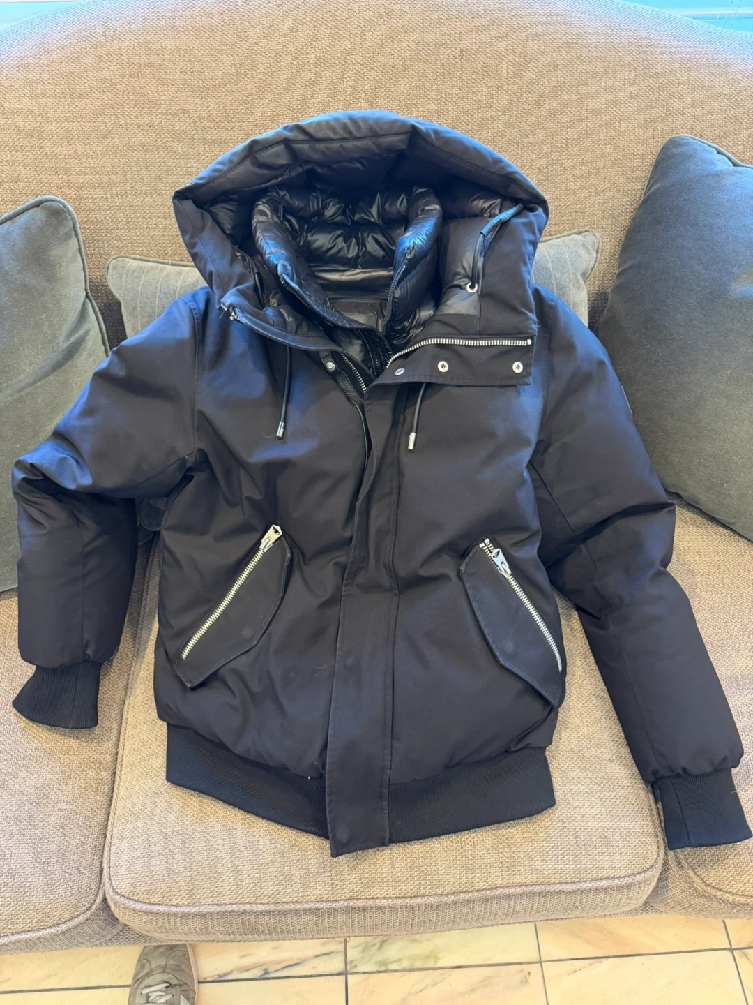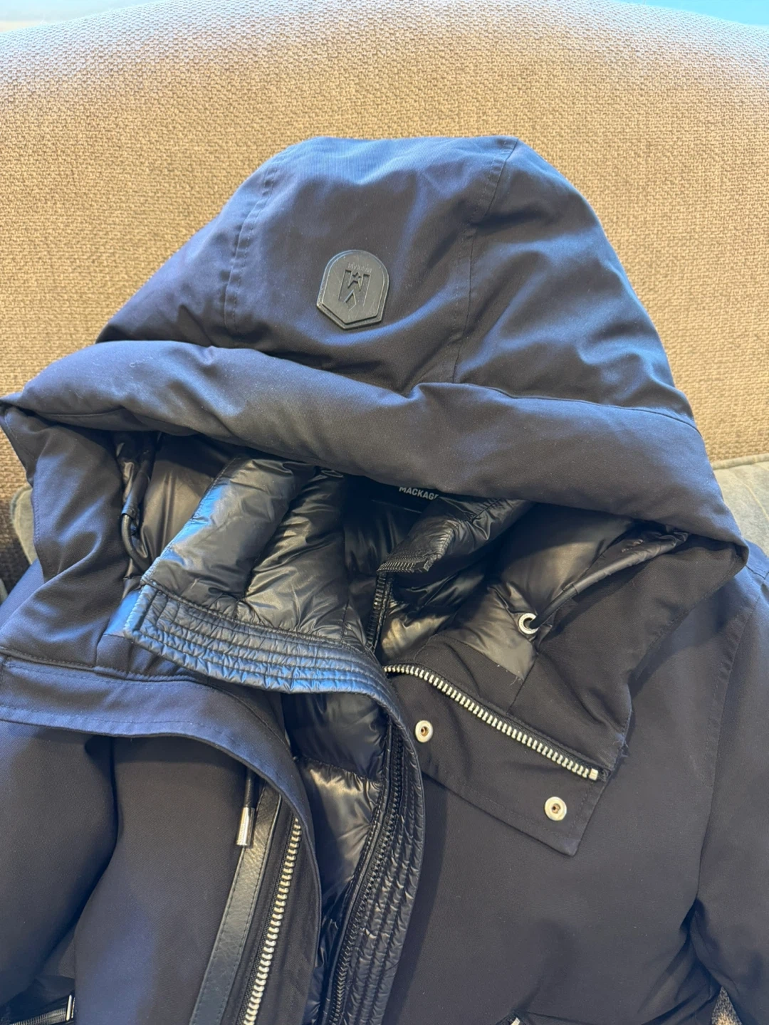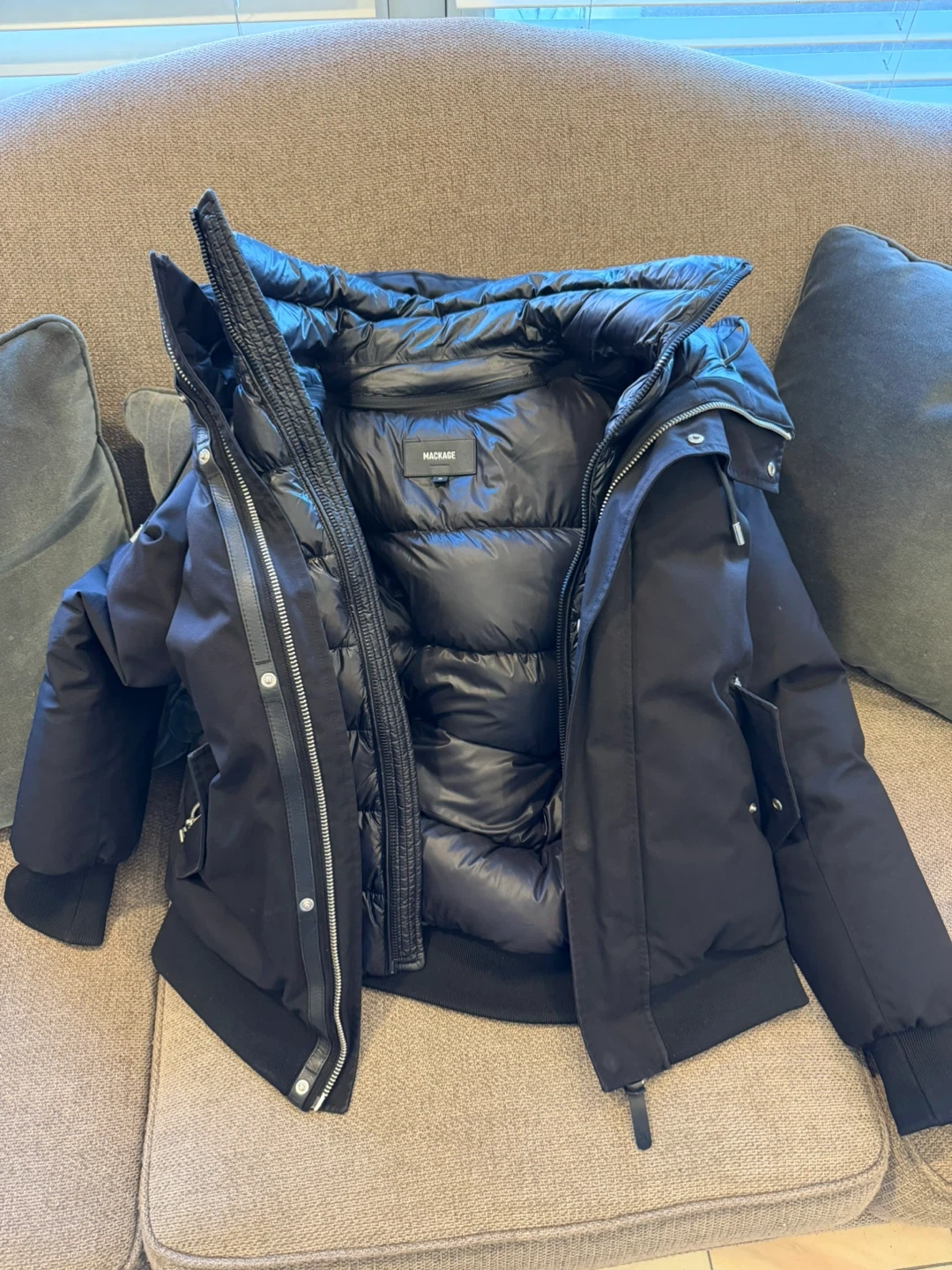 Black Mackage winter jacket. Features a puffer design with a removable hood and zippered pockets. It's size 40.best reasonable offer by Wed. Morning takes it
