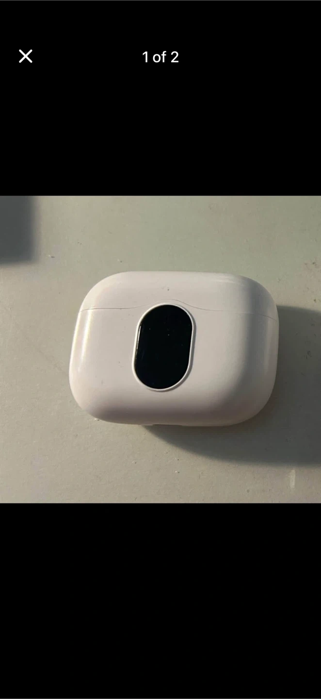 This is a white wireless charging case designed for earbuds. It features a black oval indicator light on the front. Case only, earbuds not included. The earbuds r in the case! Never used