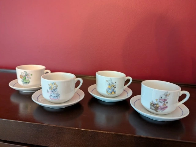 Ceramic tea party set with a cute bunny design. Includes one teapot and lid (approx. 6 in tall), four cups and saucers, and a creamer and sugar bowl with lids. Perfect for a tea party with the kids in your life, at Easter or any time. Used - like new. Cash accepted.