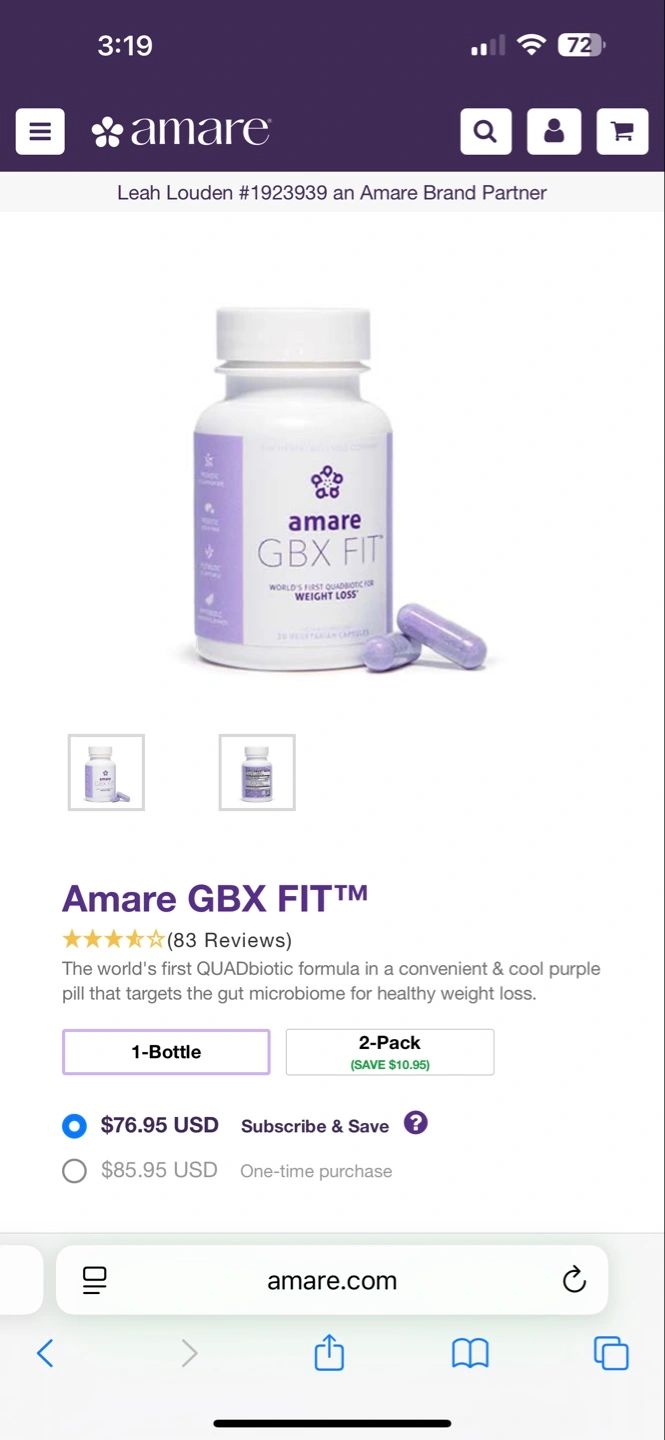 New, unopened bottle of Amare GBX FIT weight loss supplement. 30 vegetarian capsules. World's first quadbiotic formula. Targets gut microbiome for healthy weight loss. Expiry date 12/2025.