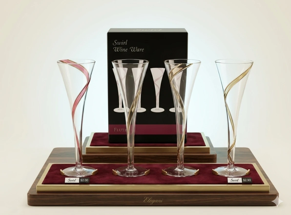 Unique Design: Each 8oz (240ml) flute features a delicate, hand-styled swirl in a different color: Pink, Sky Blue, Soft Yellow, and Silver-Grey.