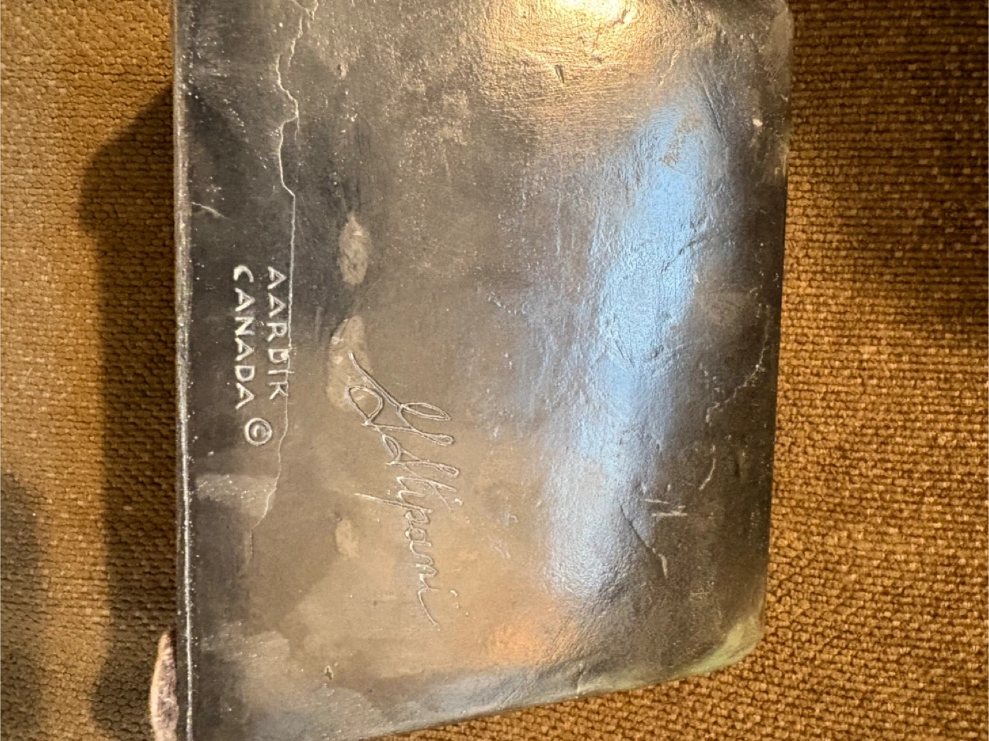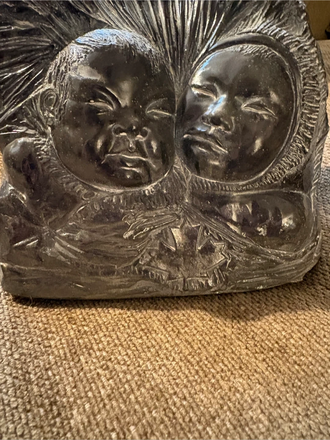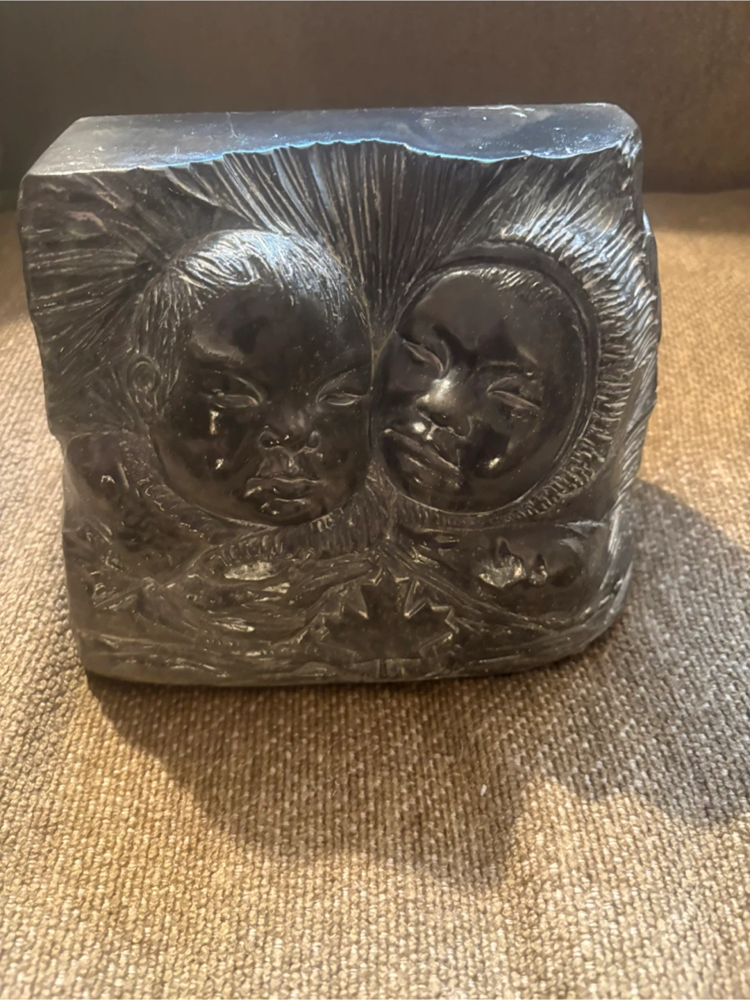 This is a carved stone sculpture featuring two faces. It's etched with "AARDVK CANADA" and a signature G.Stipani Soapstone . This piece would look great as a decorative accent.