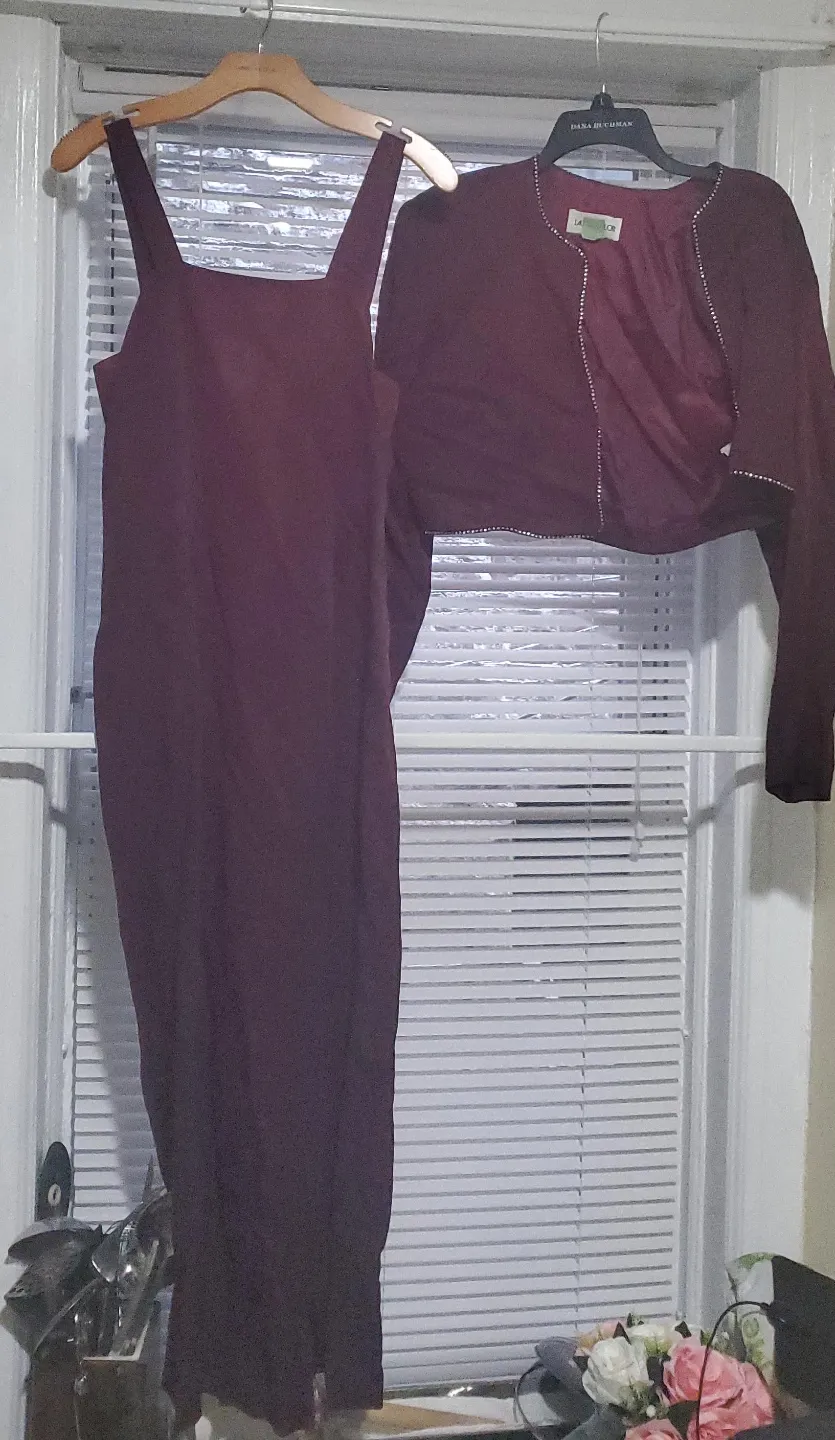 Two-piece dress set by La Fleur. Includes a burgundy sleeveless dress and a matching cropped jacket embellished with rhinestones. Dress material is smooth and opaque.
