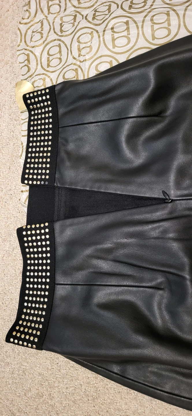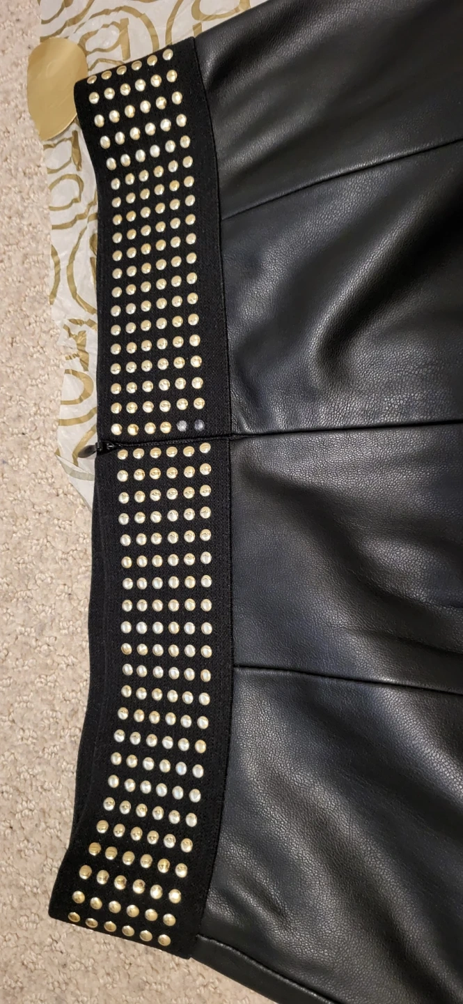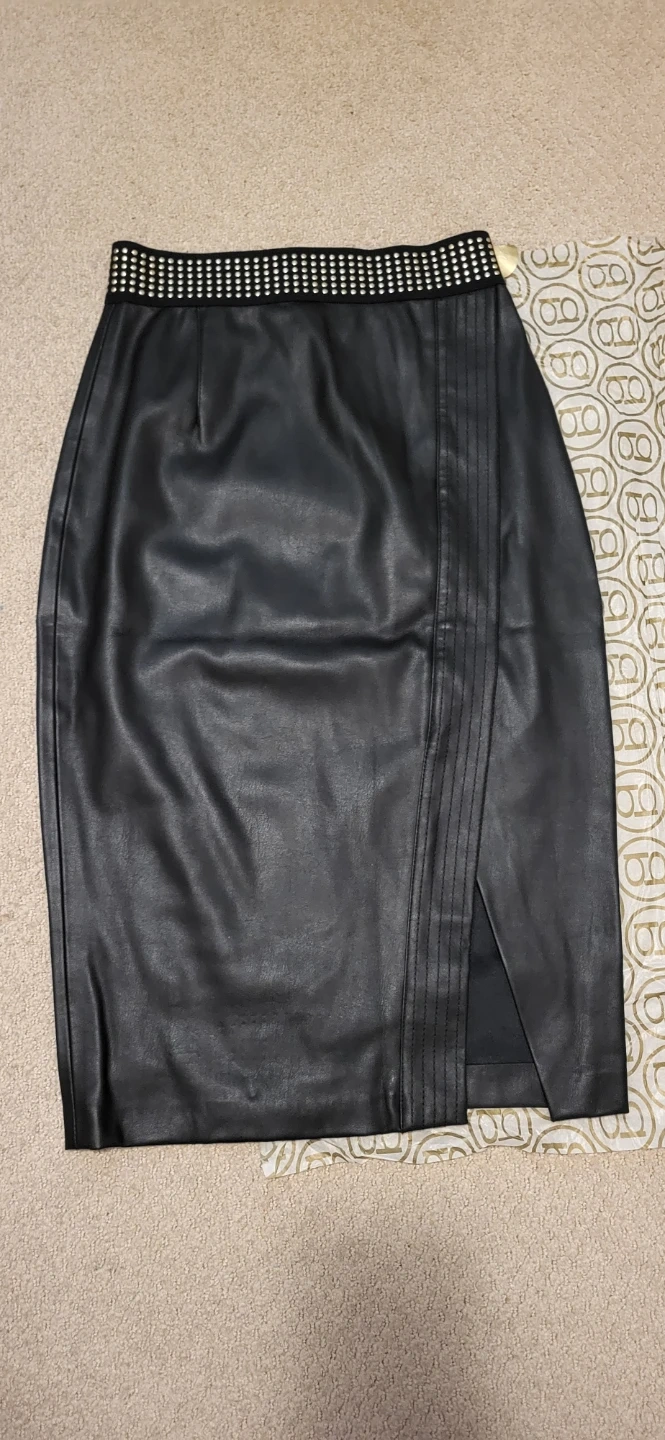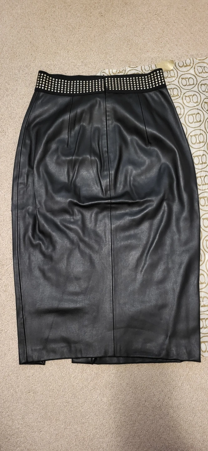 Zara Basic Collection faux leather midi skirt 68 cm (26.77 in) length. Elastic waistband with metal studs. Missing 2 studs near zipper.