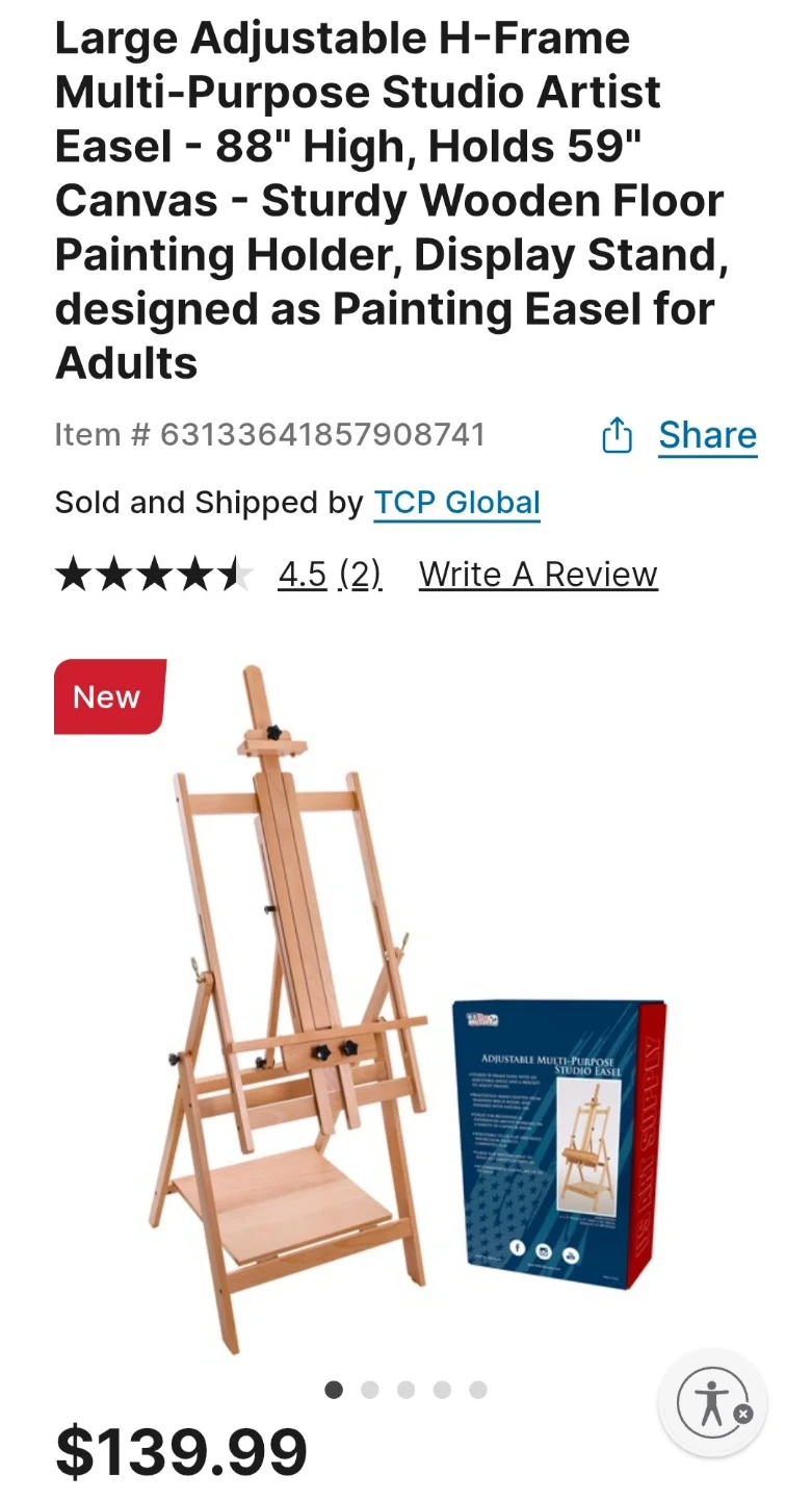 This large adjustable H-frame easel is designed for studio use. It can hold a maximum canvas height of 59 inches and has a maximum easel height of 88 inches. The easel folds up for easy storage.
