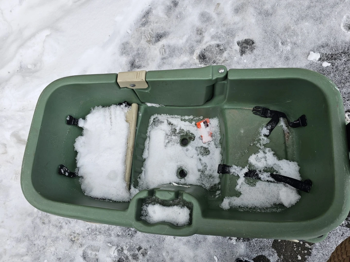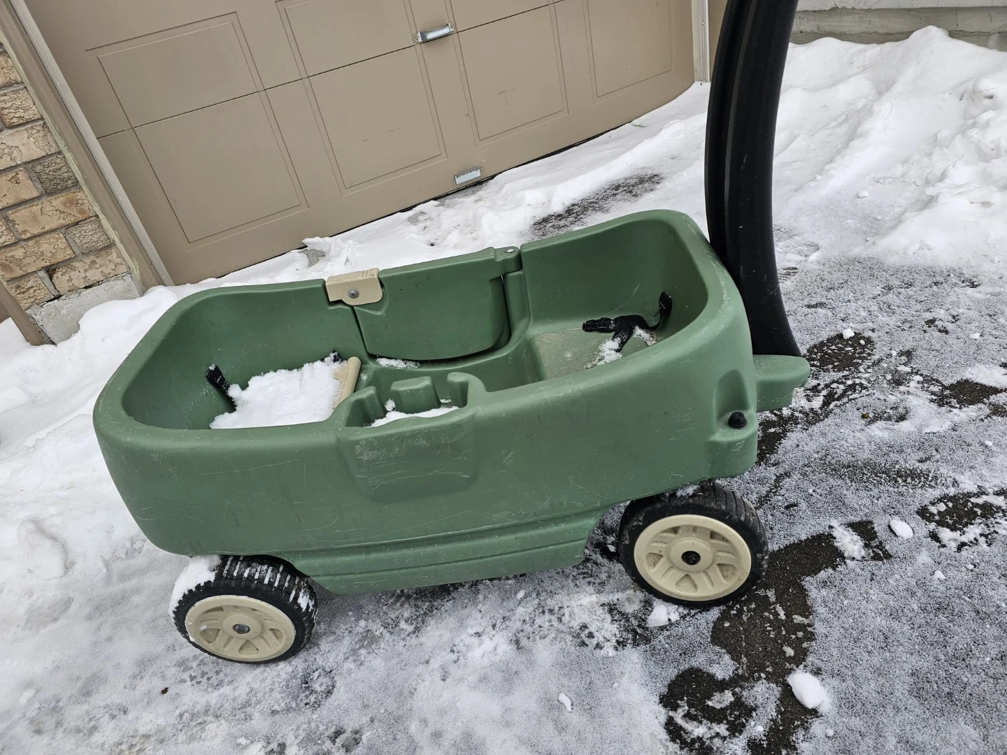 This is a green plastic wagon, perfect for hauling toys or gardening supplies. It features a sturdy handle for easy pulling. Its durable construction makes it great for outdoor play or yard work.