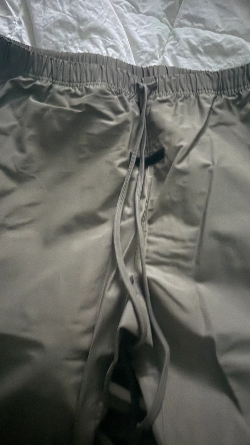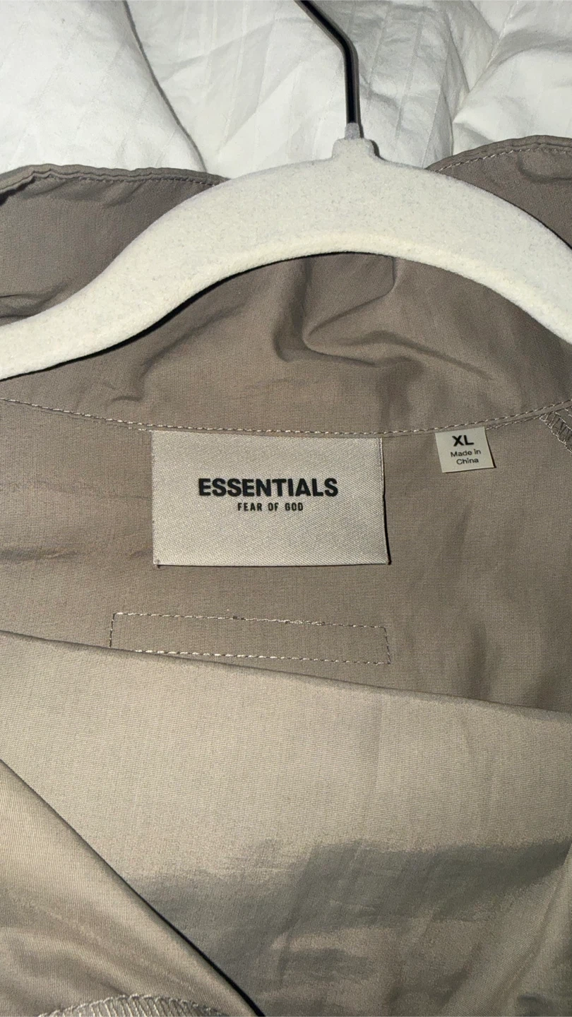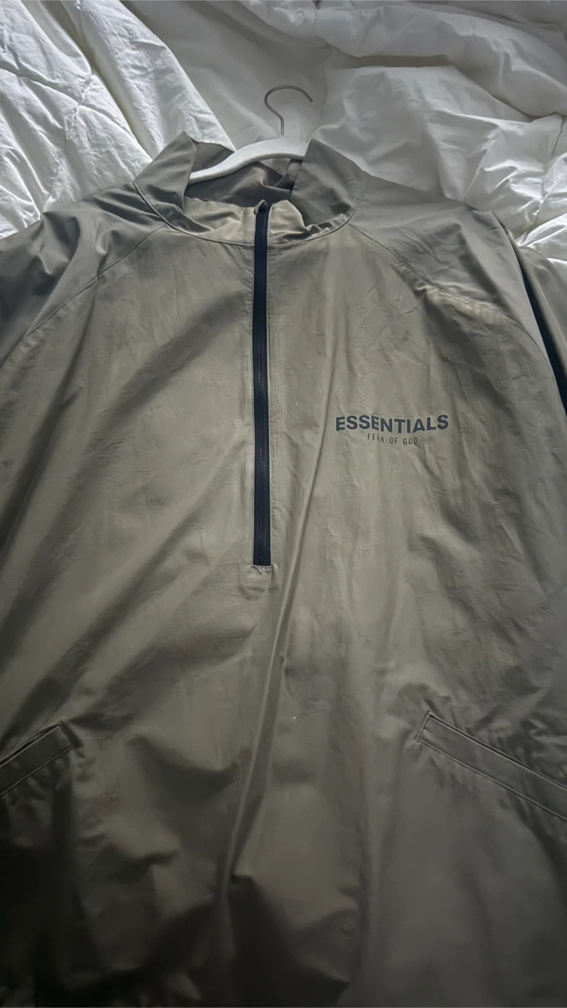 This is a set including a Fear of God Essentials jacket and pants. The jacket is olive green with a quarter-zip closure and the pants are taupe with an elastic waistband and drawstring. Jacket is a size XL and Pants are a Large