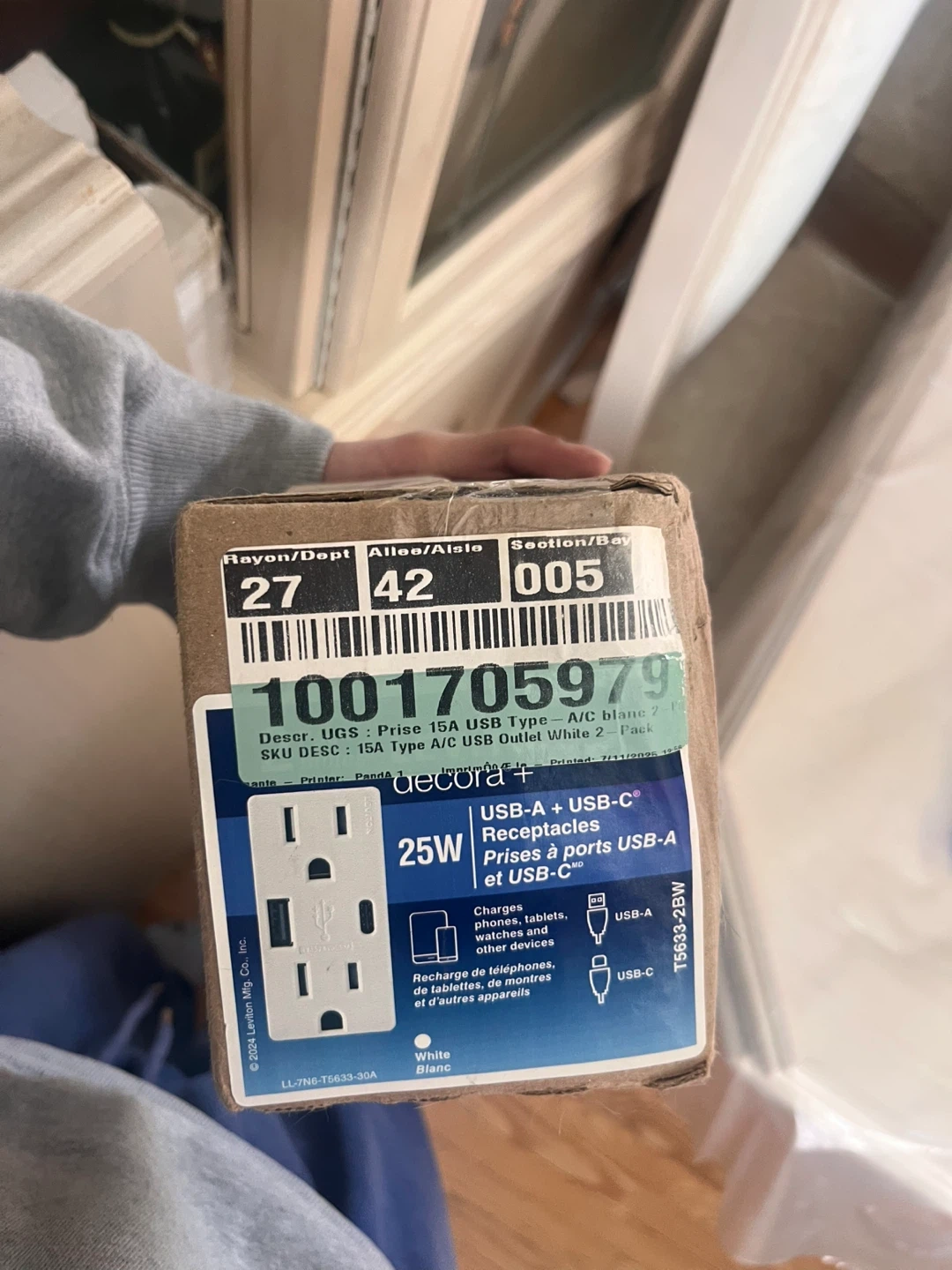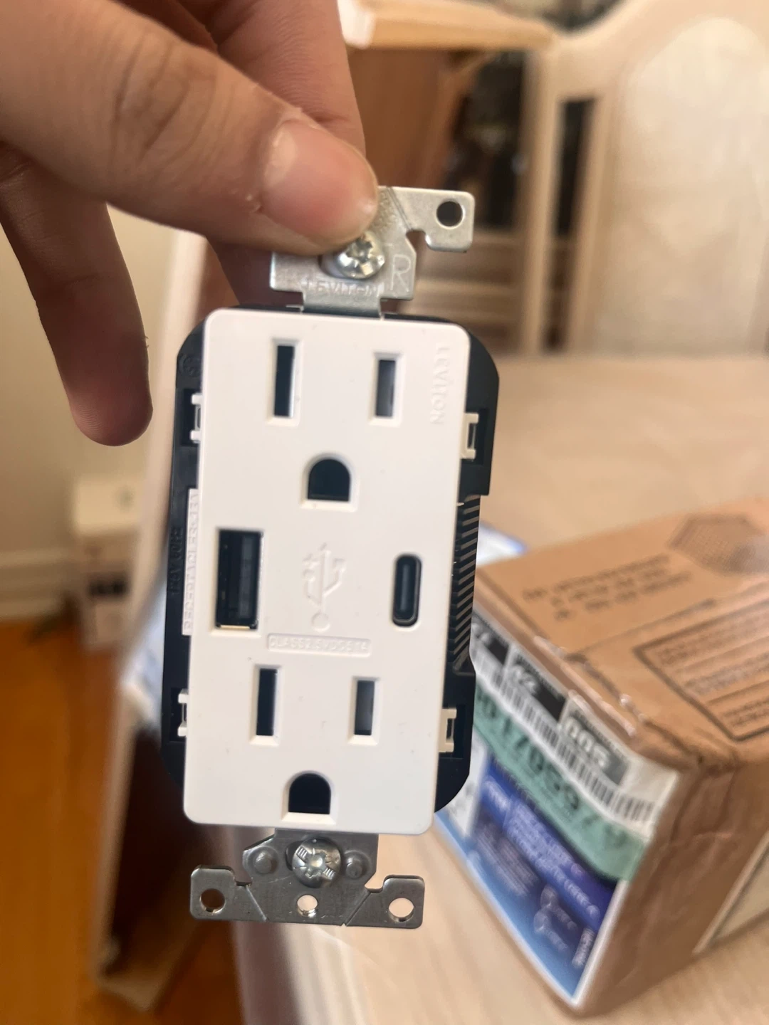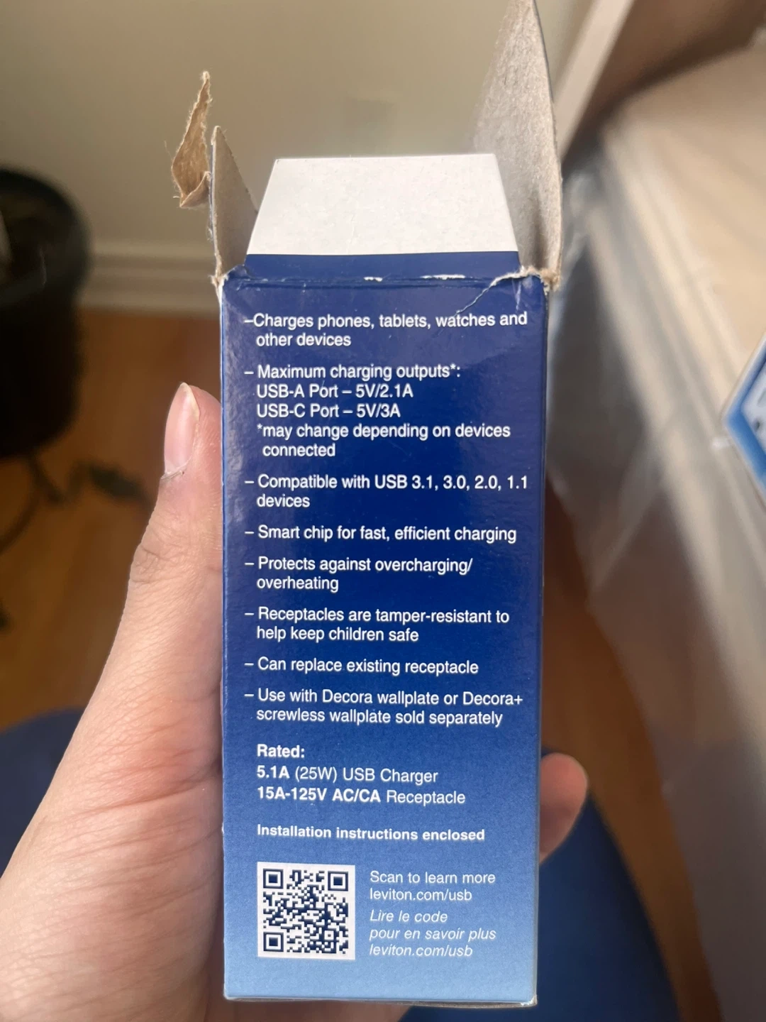 Leviton Decora+ USB-A and USB-C receptacles in white. Charges phones, tablets, watches, and other devices. Rated for 5.1A (25W) USB charging. Tamper-resistant design.