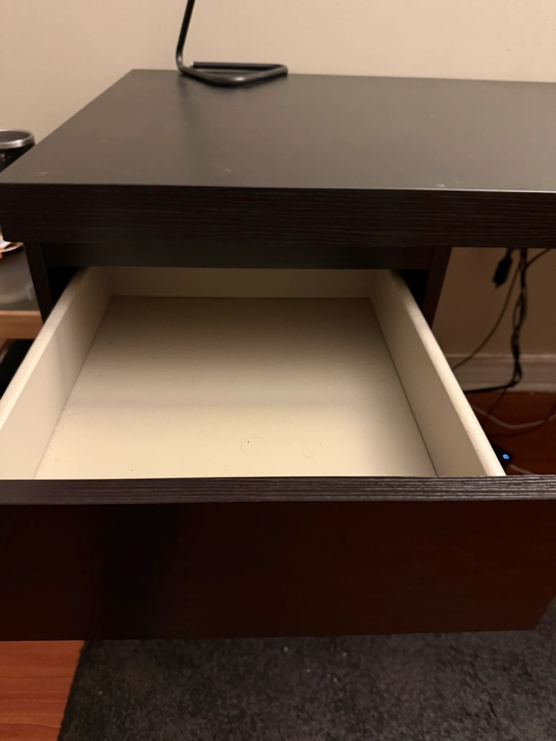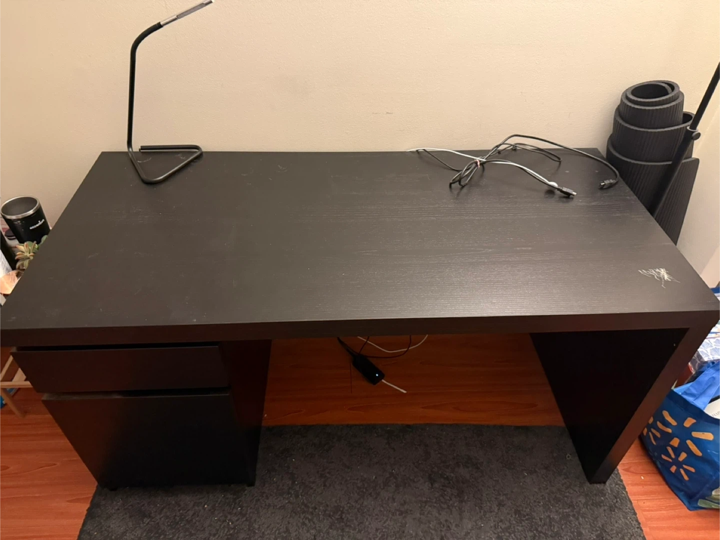 IKEA malm Dark brown desk with two drawers on the left side. Wood-grain finish. There is some visible scratches but can usually be hidden with a keyboard mat.