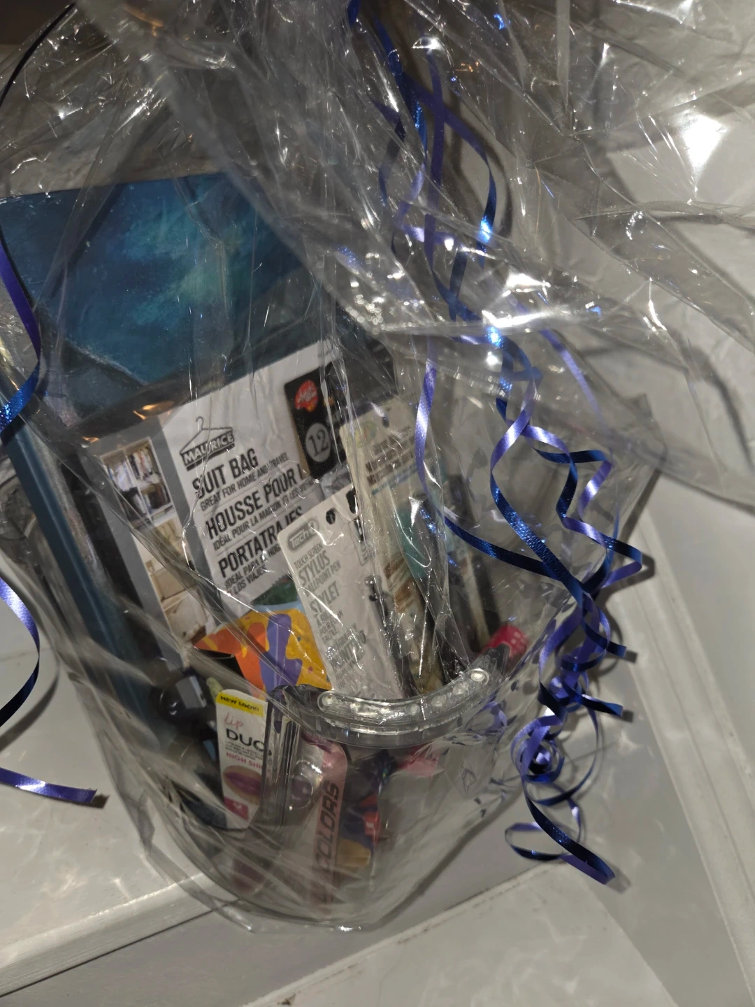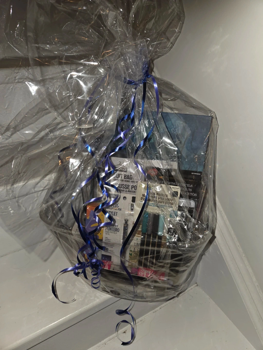 This gift basket includes a Memorex MS-WORD PC Reference Guide. It also contains a travel suit bag and a stylus pen. It's a great collection for someone needing handy computer accessories. It has a lipstick, art materials and a shower gel.