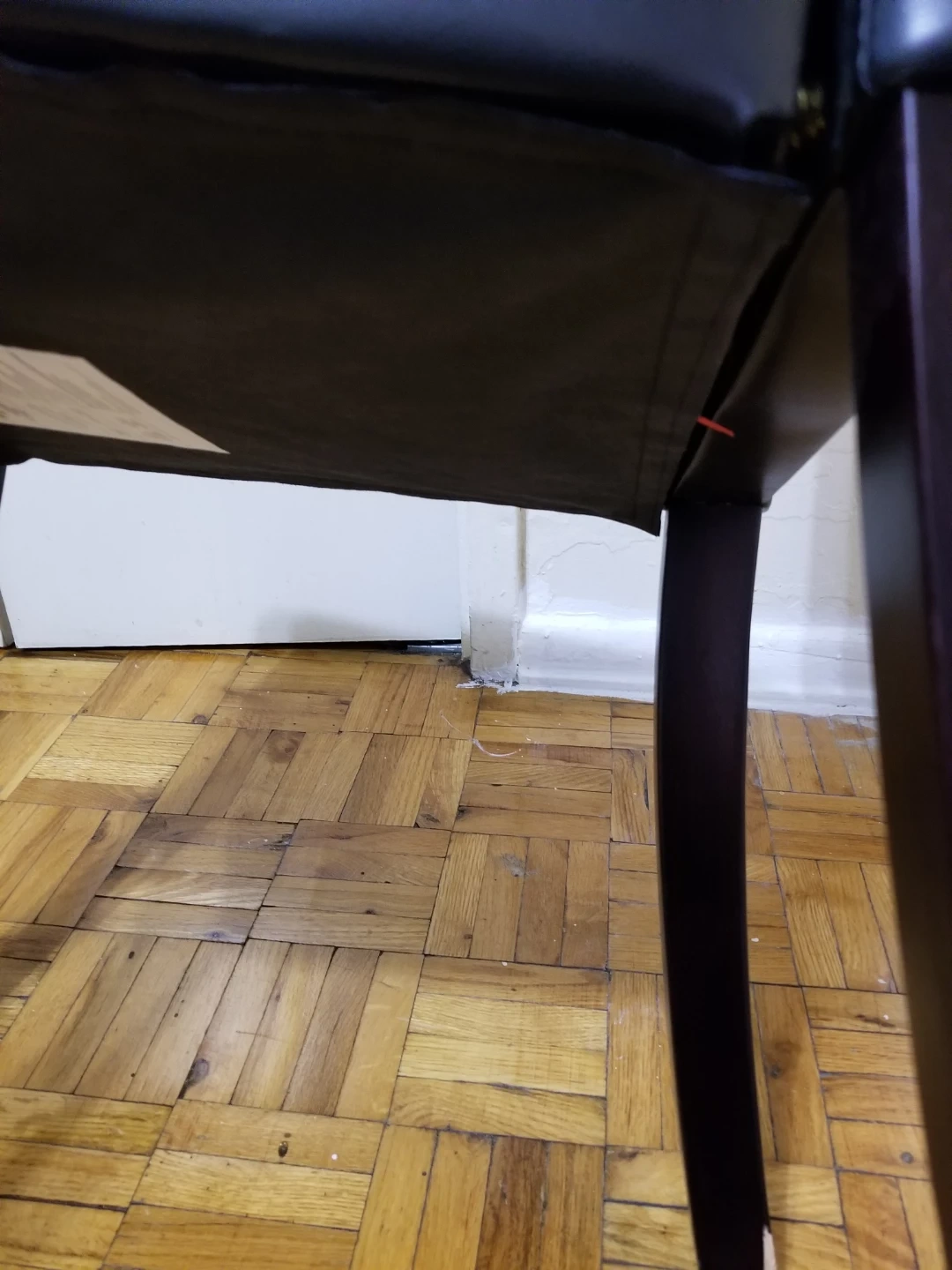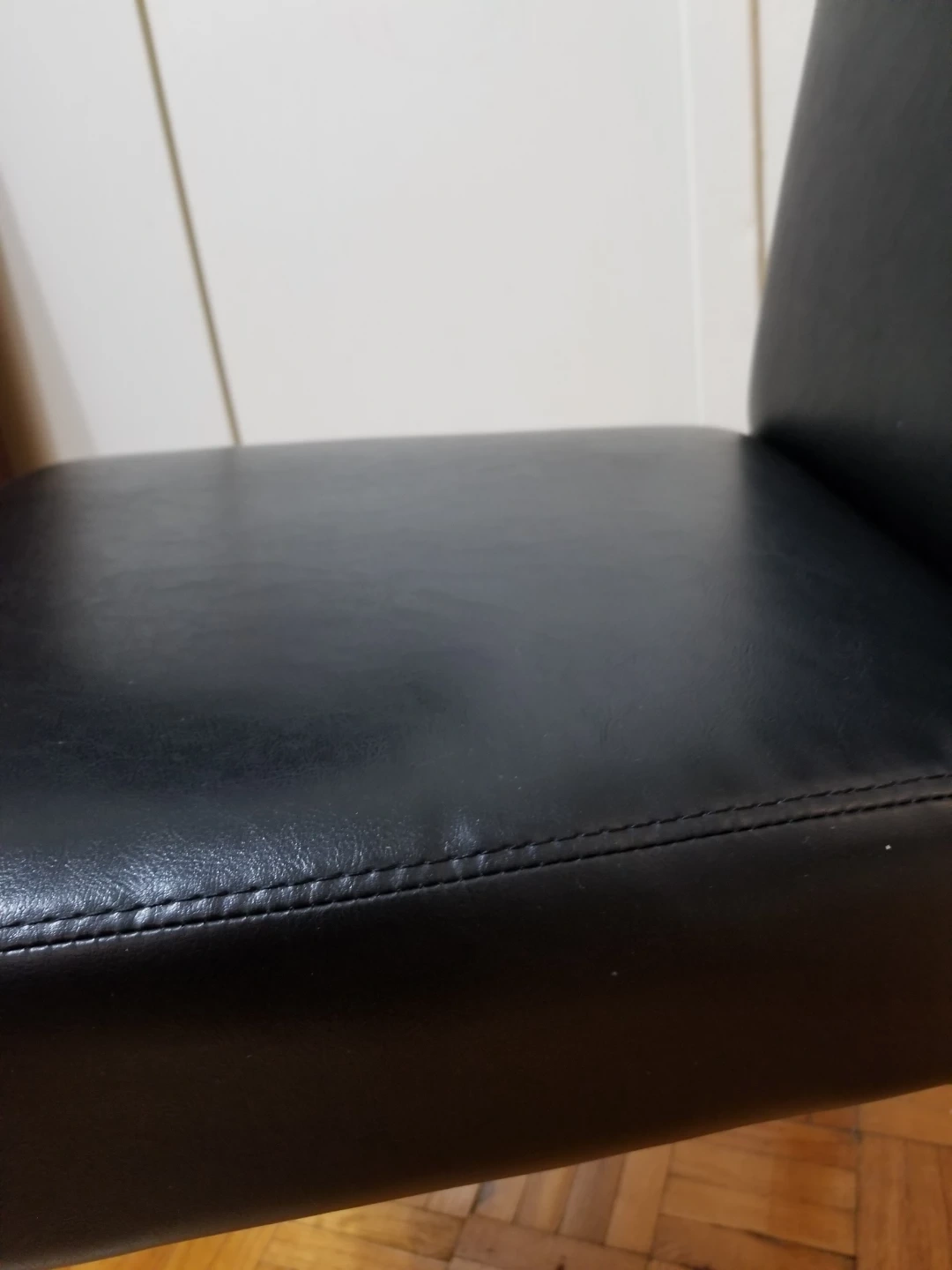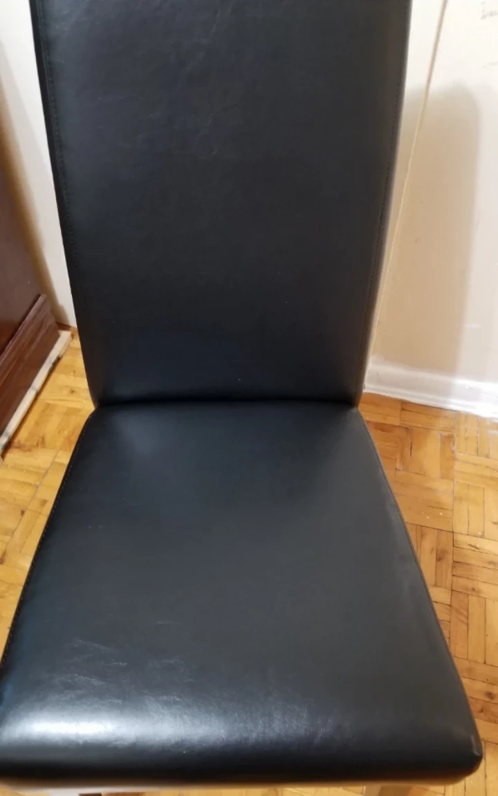 This black faux leather dining chair offers a sleek look for your dining space. The chair features a comfortable seat and back with stitched detailing. Its dark wooden legs provide sturdy support.