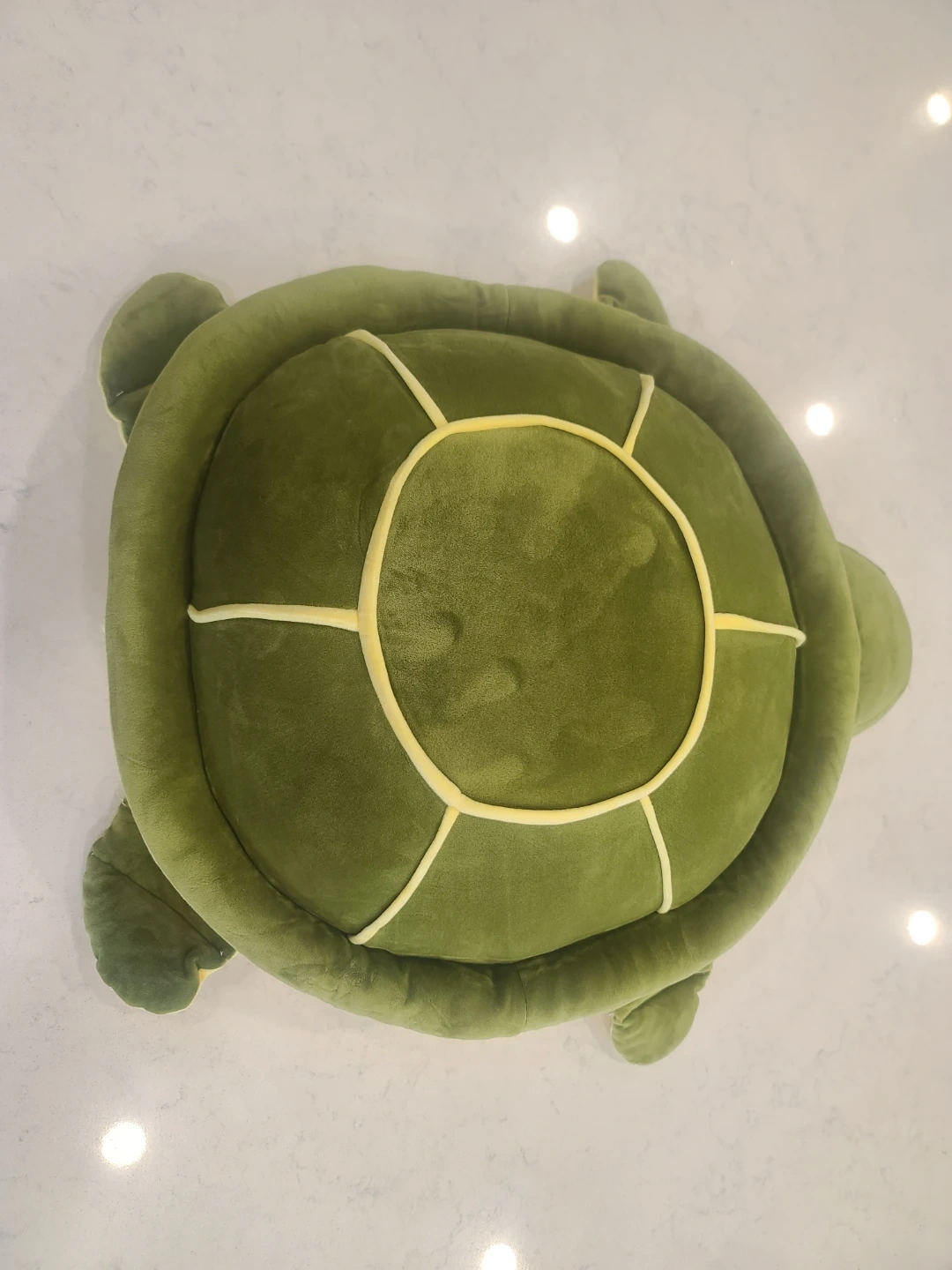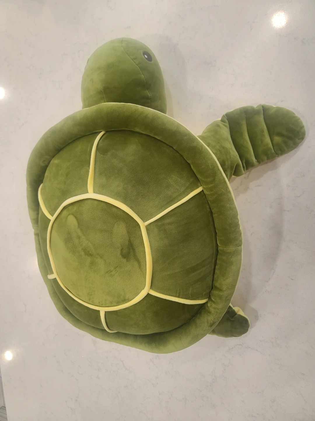 This is a plush, green turtle pillow in good condition. It would be a great addition to any child's room or as a fun decorative piece for turtle enthusiasts of any age. If the ad is up, the turtle is still available.