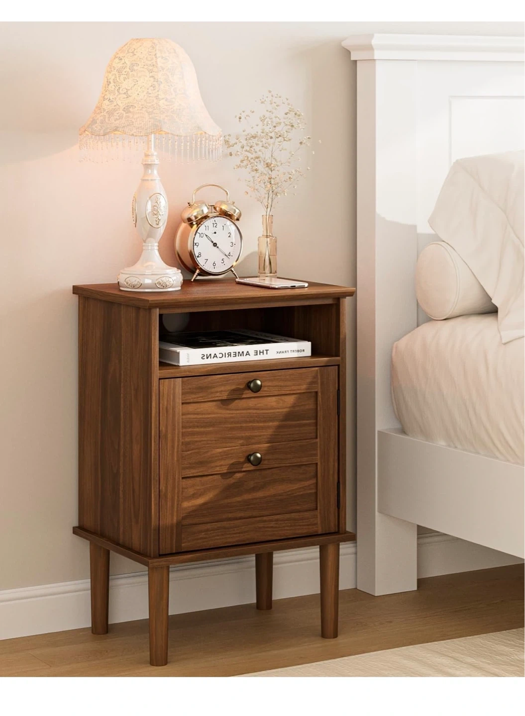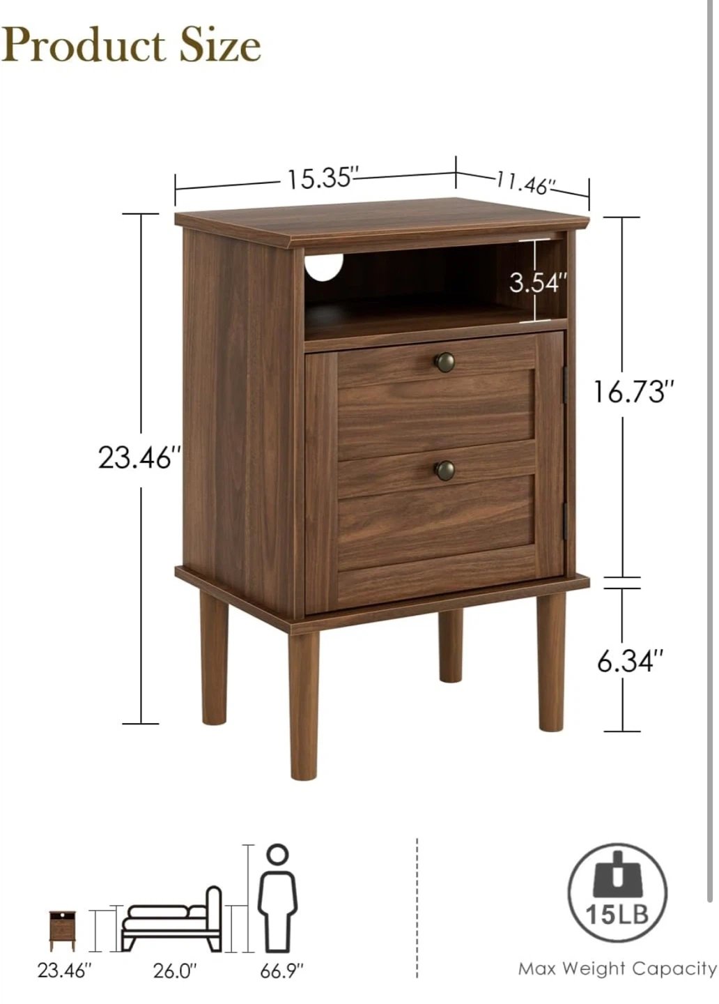 This wooden nightstand features a warm walnut finish and a mid-century modern design. It's equipped with two drawers and an open shelf for storage. Max weight capacity is 15lb. A great addition to any bedroom!