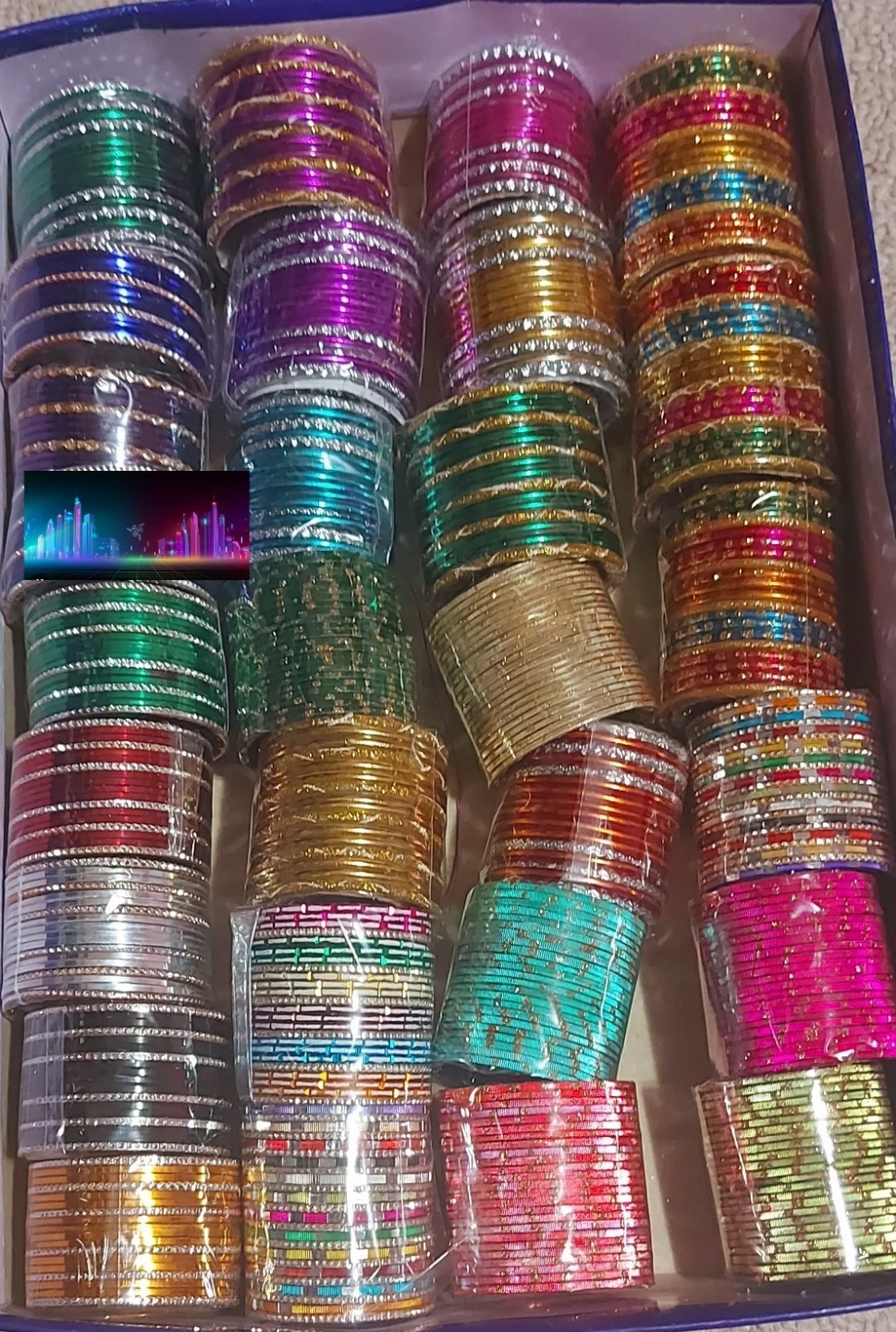 A collection of colourful bangles. These bangles are primarily made of metal with decorative accents. They come in a variety of vibrant colours and patterns, including gold, silver, blue, green, pink, and red. Perfect for adding a festive touch to any outfit!
