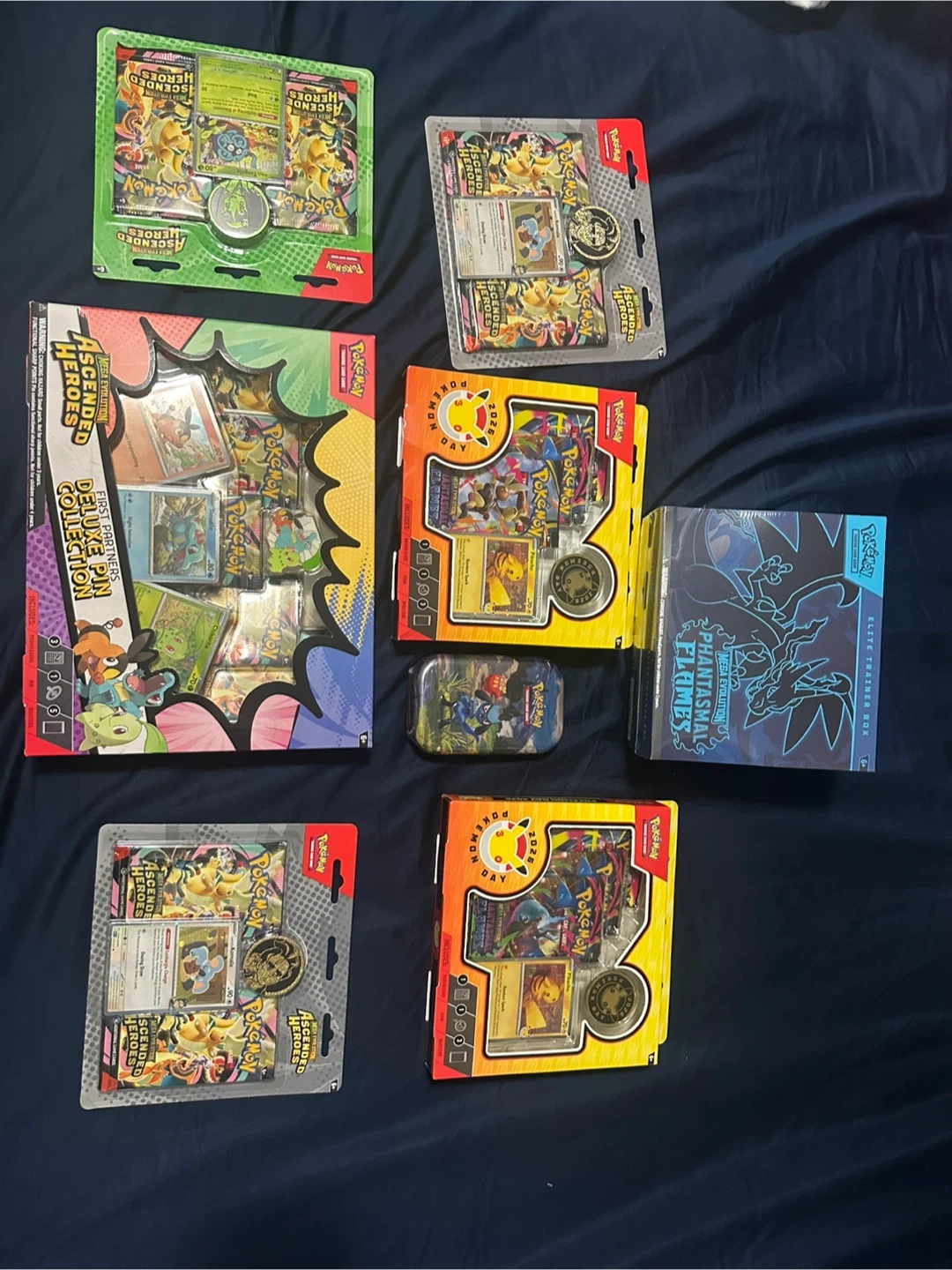 This lot includes multiple Pokémon Trading Card Game sealed products. You'll find Ascended Heroes packs and small tin collections, plus an Elite Trainer Box from the Phantasmal Flames expansion. Great for collectors and players alike!