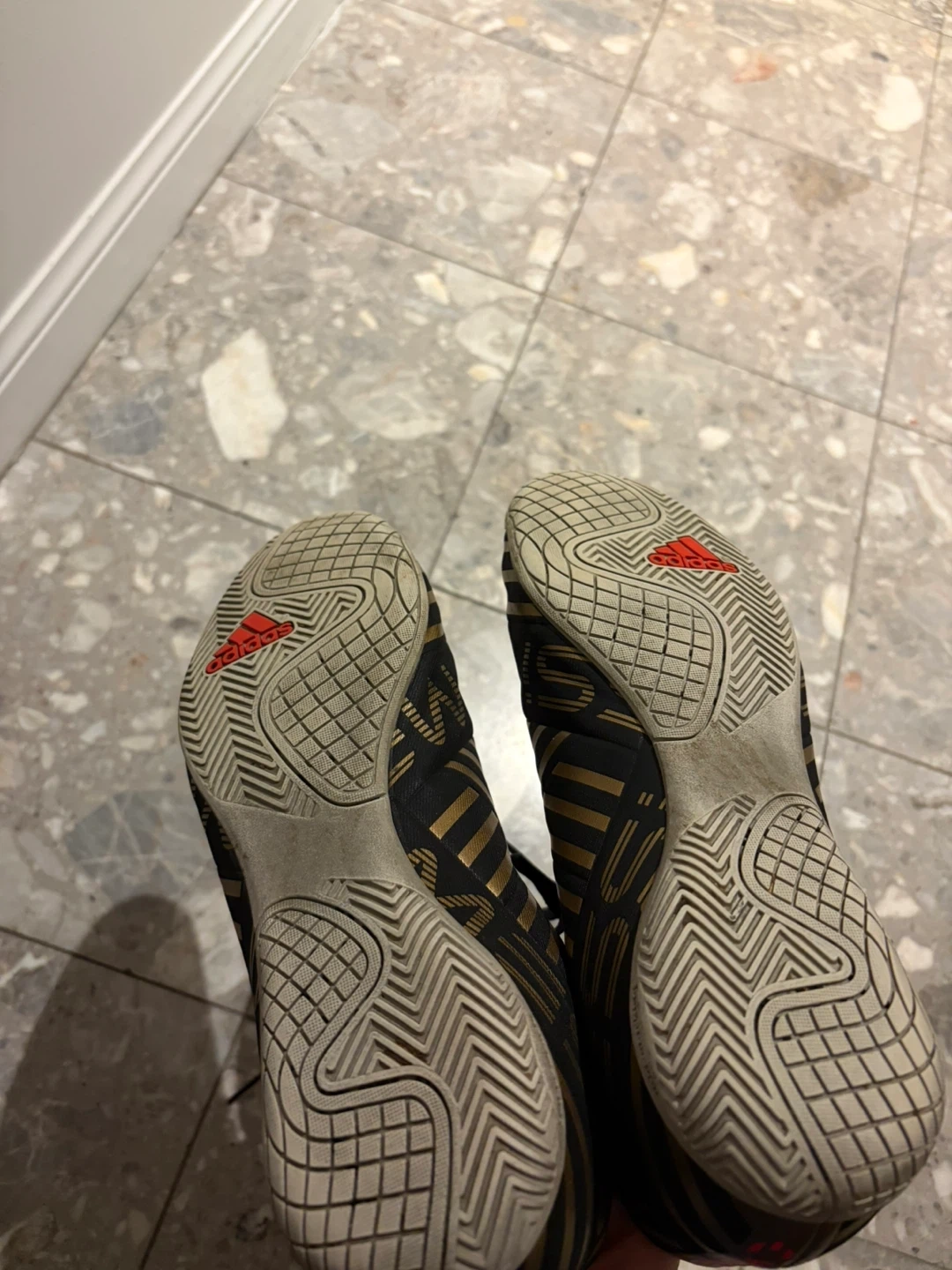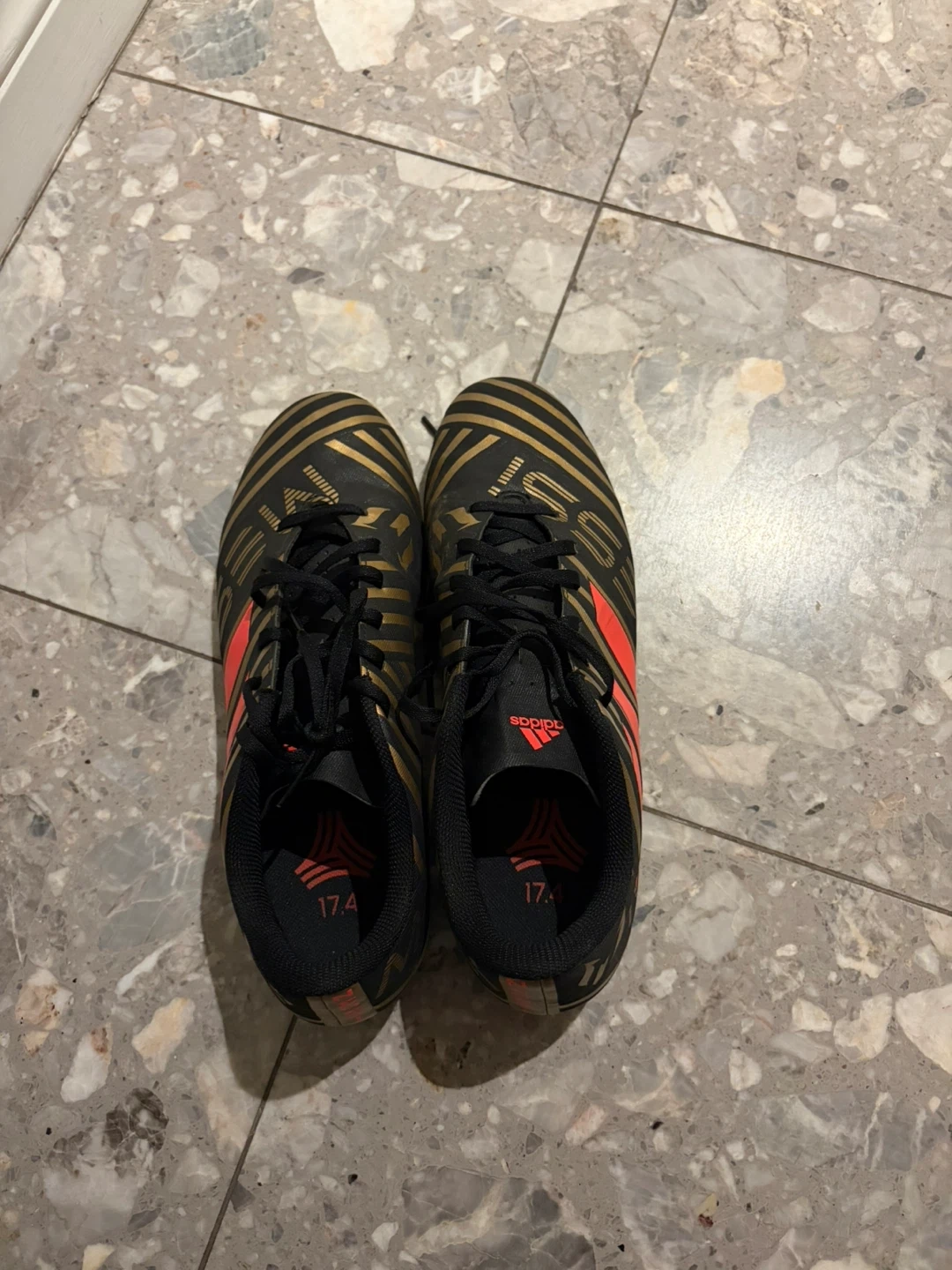 Black and gold Adidas Nemeziz Messi 17.4 FXG soccer cleats. These cleats feature a synthetic upper and a durable outsole for firm ground traction.