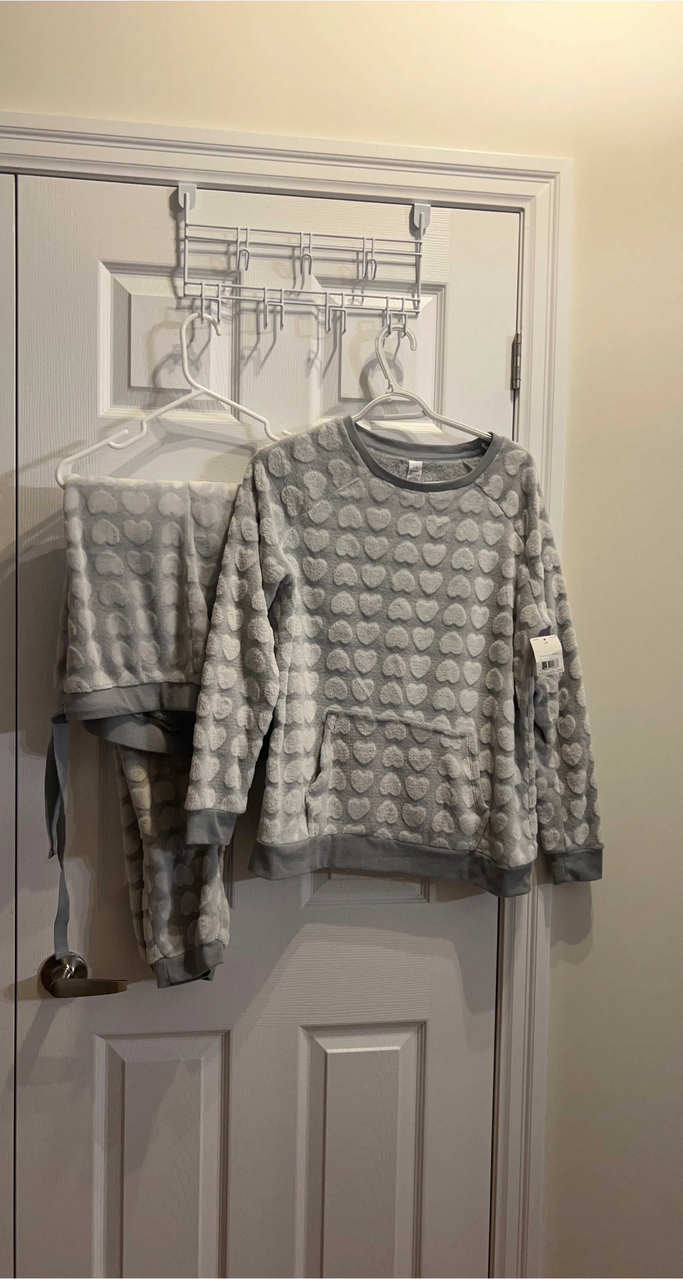 Super soft fleece pajama set with a cute all-over grey heart pattern. Includes a long-sleeved top with a front pocket and matching pants. It's a comfortable loungewear option for cozy nights in!