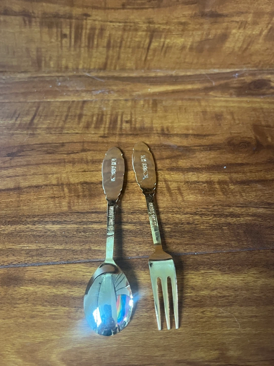 This is a gold-plated spoon and fork set from Hanbit. The handles have a decorative embossed design. It's a unique set for dessert or serving.