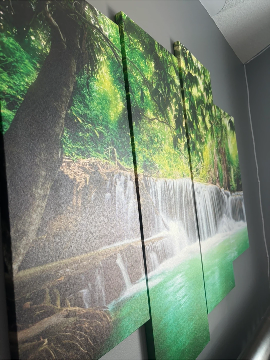This set features a stunning four-panel canvas print depicting a lush green jungle waterfall scene. It's ready to hang and will bring a vibrant natural element to any room.