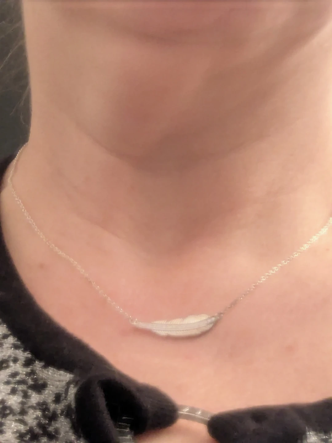 Sterling Silver Feather pendant necklace on a silver-tone chain. Comes with a pair of gold-tone and black hoop earrings. These accessories add a touch of style.