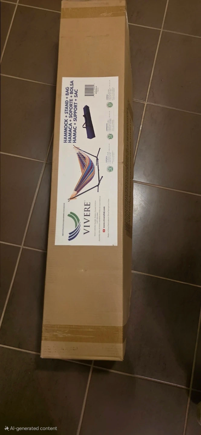 This Vivere hammock set includes a hammock, stand, and carrying bag. It's a complete package for relaxation. The hammock itself features a colourful striped design. Includes original packaging.