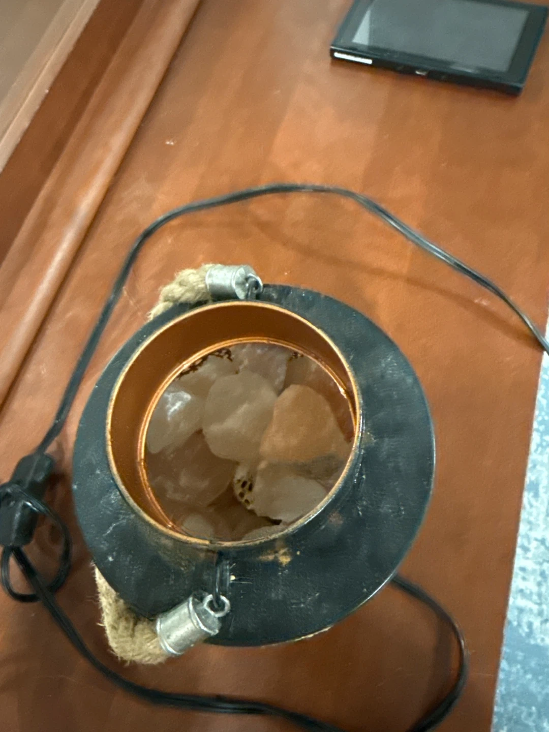 Decorative lantern style tealight holder filled with natural Himalayan salt chunks and small pebbles. It features a rustic black metal finish with intricate cut-out patterns and a rope handle detail. Perfect for creating a warm, ambient glow in any room!