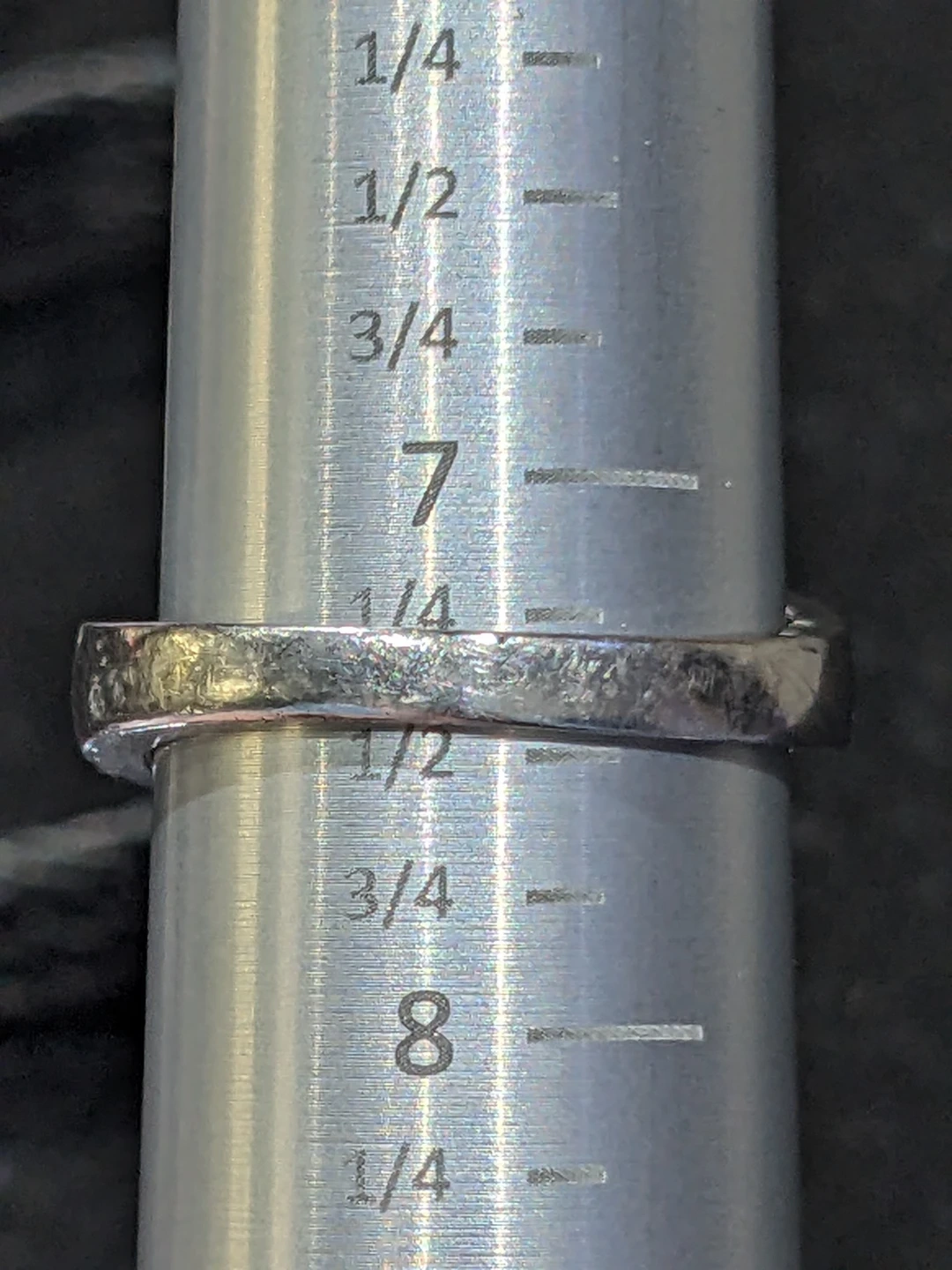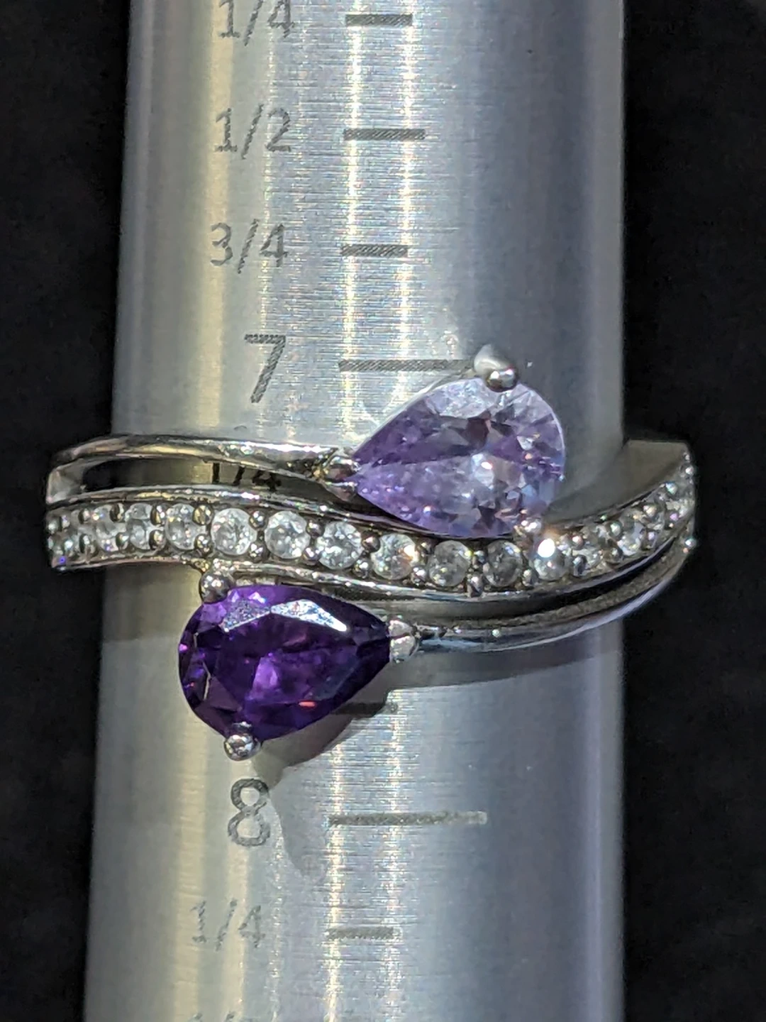 This ring features two pear-cut cubic zirconia, one deep purple amethyst and one lighter lavender gemstone, accented with small clear CZ stones. The band is crafted from sterling silver (stamped 925). The brand is Amor, and was purchased at Hudson's Bay. Some slight signs of use on the bottom part of the band (picture lighting makes it look worse than it is). Size 7.5.