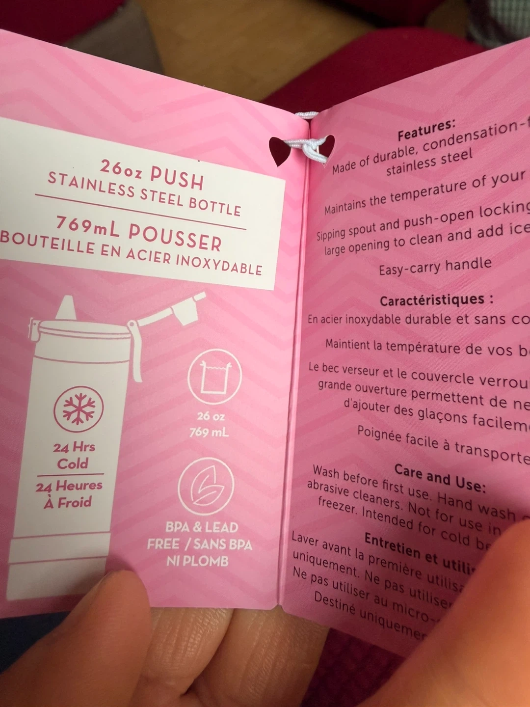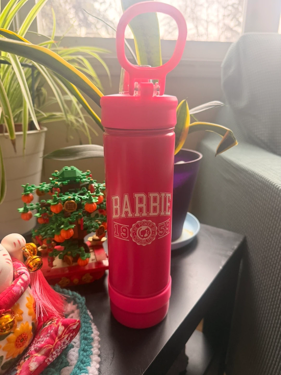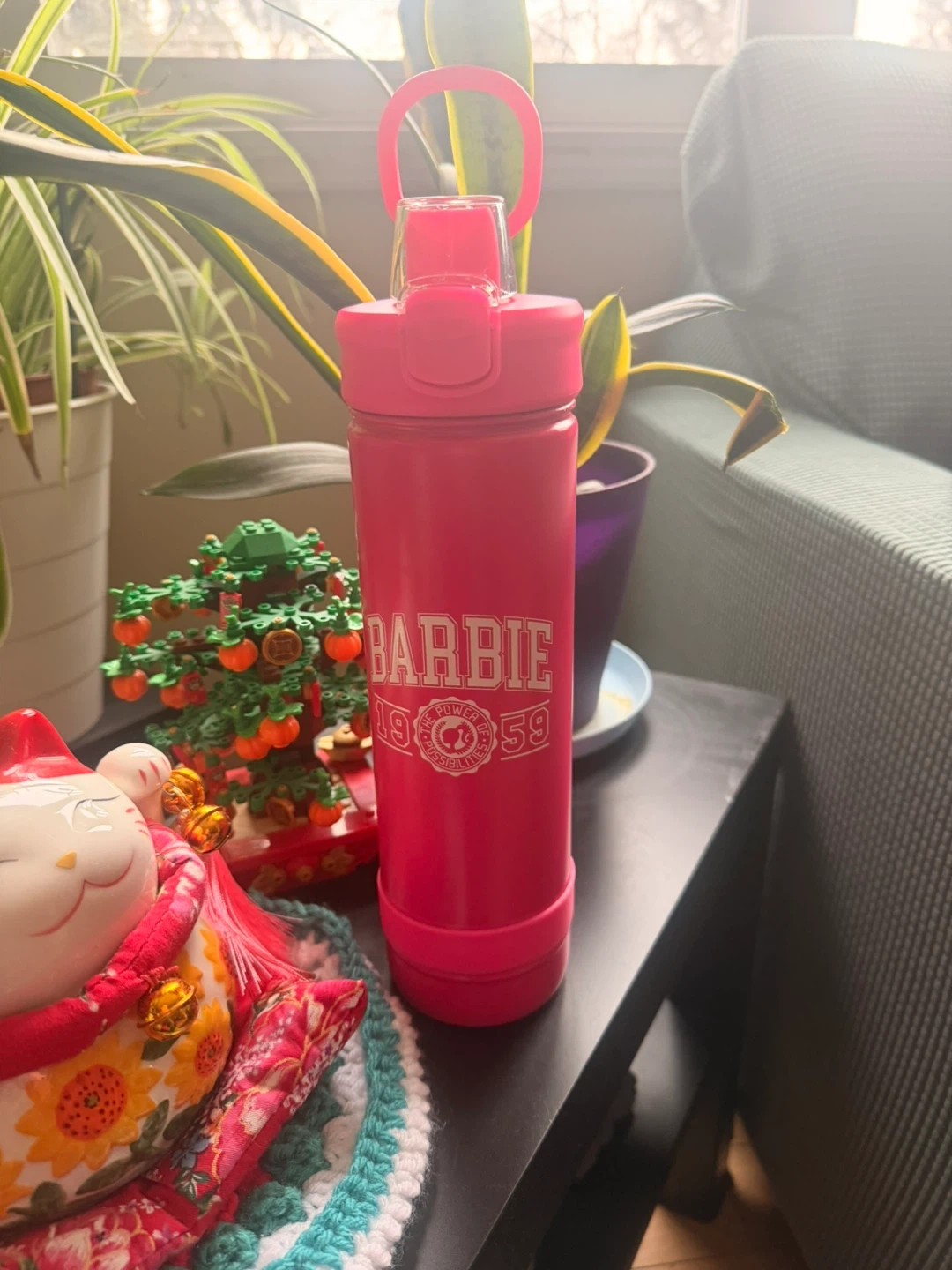 This Barbie push-top water bottle is made of durable stainless steel. It holds 26oz (769mL) and keeps drinks cold for 24 hours. The lid has a locking spout and a large opening for easy cleaning. It's BPA and lead-free.