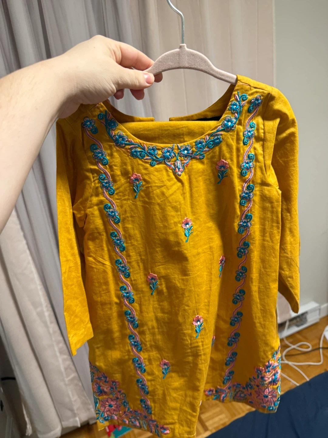 Selling a lovely yellow kurti with intricate blue and pink embroidery. It features a comfortable round neckline and three-quarter sleeves. Perfect for casual wear or festive occasions!