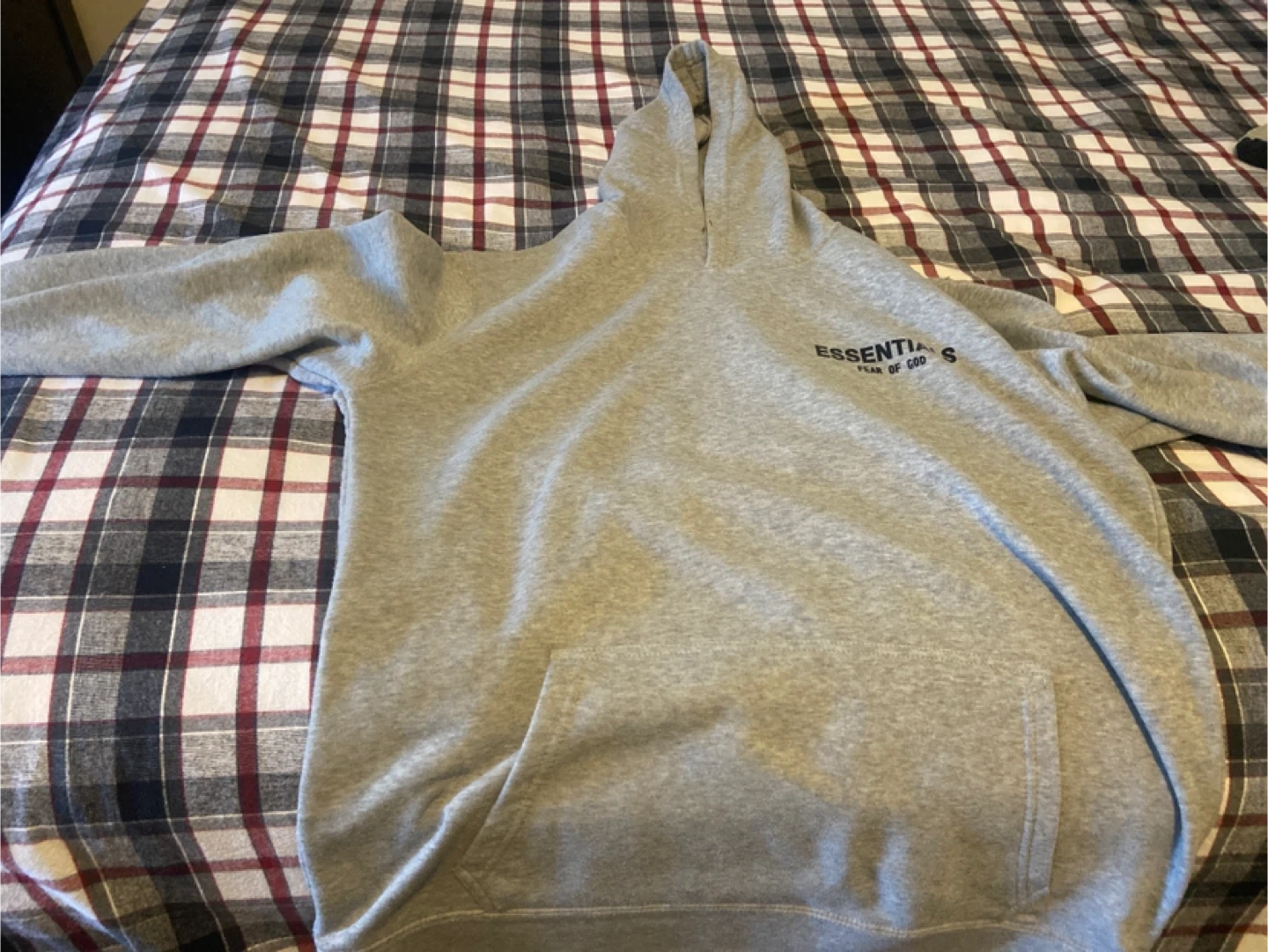 Grey hoodie from Essentials Fear of God. It's made of a soft cotton blend. This pullover hoodie has a front pouch pocket and a drawstring hood.