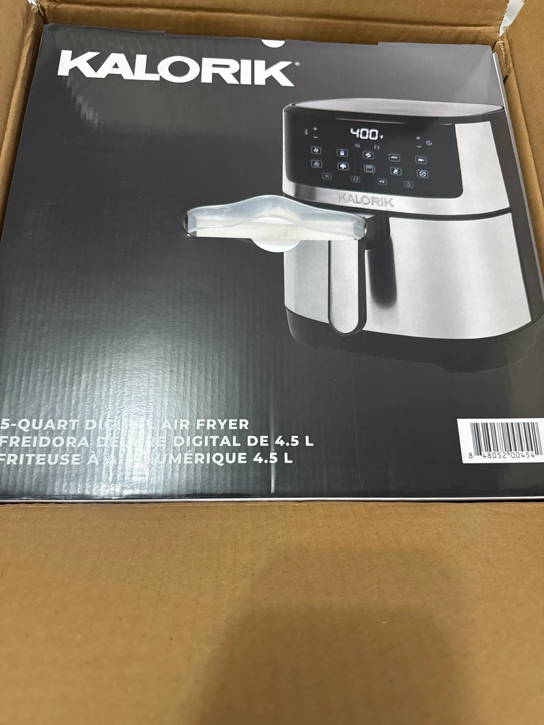 This is a Kalorik 5-quart digital air fryer. It has a 4.5 L capacity. Its digital display makes it easy to use.
