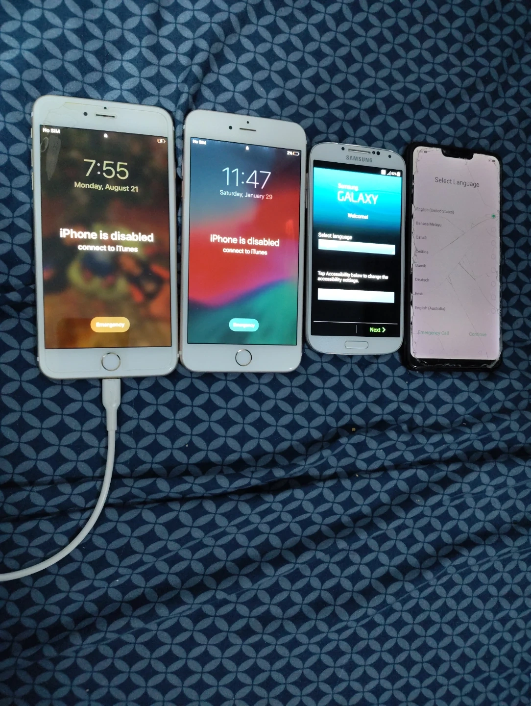 Selling a lot of 4 mobile phones. 2Apple iPhone 6S, 1 oppo 3E, 1 Samsung Galaxy S4 phones in different colors. Both iPhones are locked. Oppo and Samsung phones are unlocked. Good for collectors of old phones or spare parts.