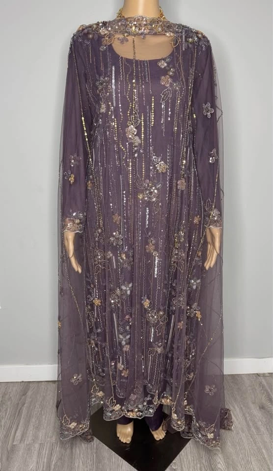 Real Turkish cutdana Pakistani net dress. No pasting, all work with thread. Almost 3 meter dupatta. Shirt length: 48 inches, Shirt chest: 22.5 inches. Trouser length: 38 inches. Purple Mauve color.