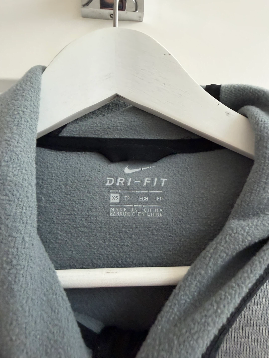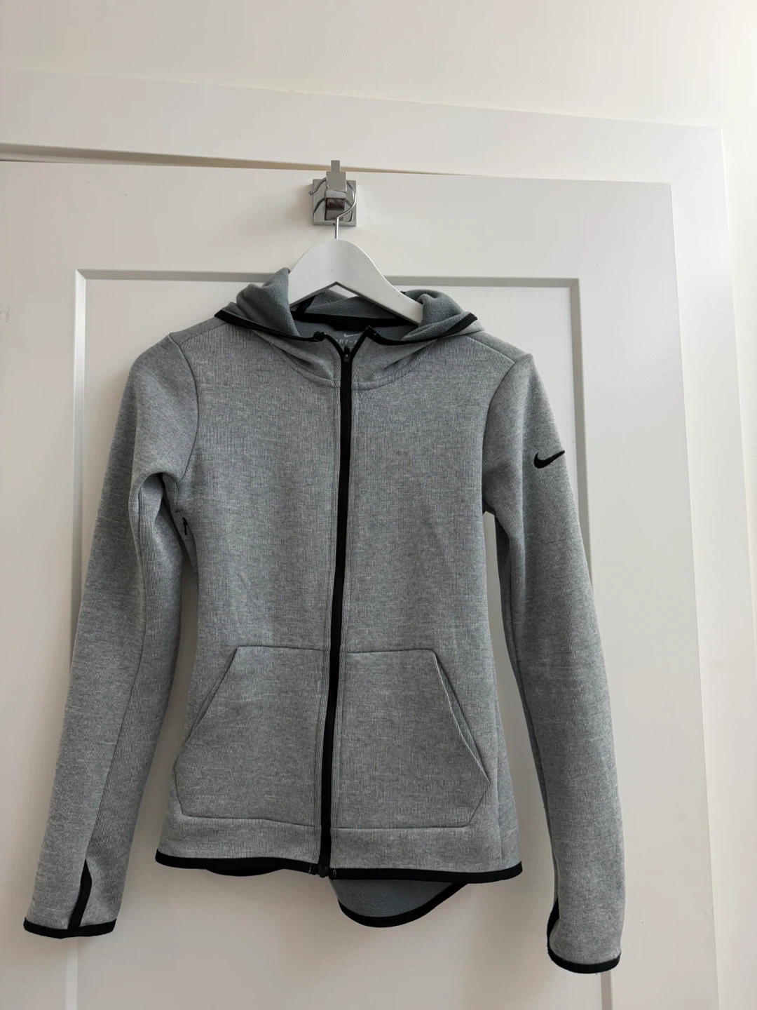 Selling a Nike Dri-FIT hoodie in size XS. It's a light grey colour with a black zipper and trim. Perfect for workouts or just lounging around!