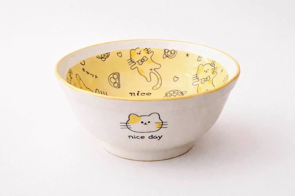 Add a dose of cuteness to your table with this adorable big ceramic cat bowl. Featuring a glossy white exterior with a sweet cat face and a cheerful yellow interior filled with playful cat illustrations, this bowl is as charming as it is functional. The smooth glazed finish gives it a premium feel, making it perfect for everyday use or as a cute statement piece in your kitchen. Ideal for soups, noodles, salads, snacks, or even as a decorative bowl.